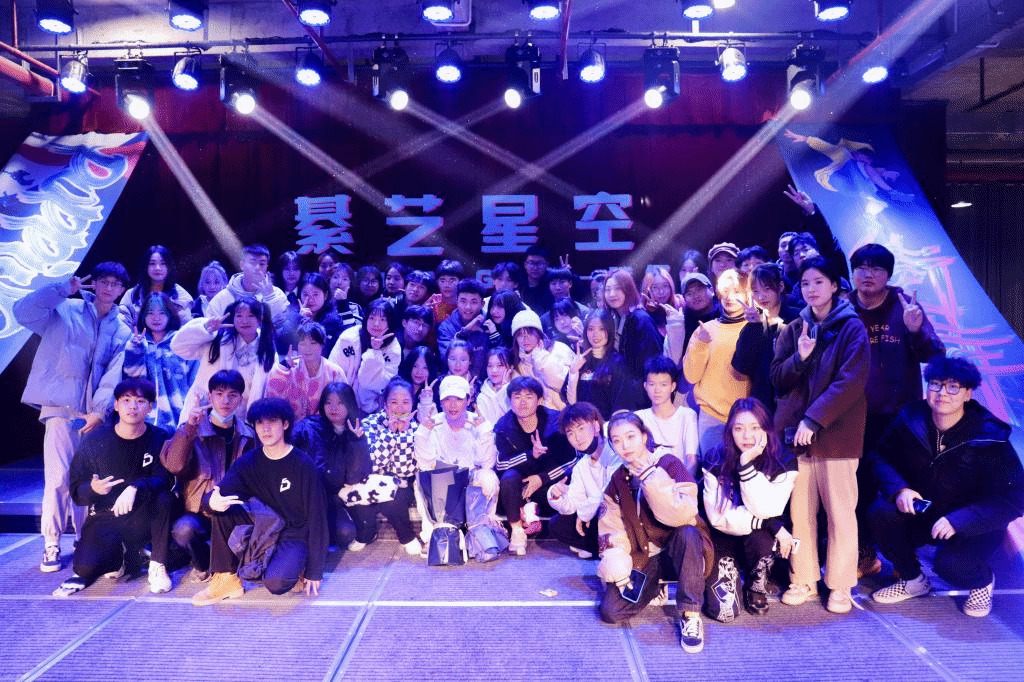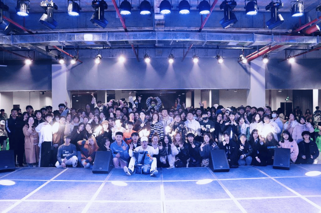 今日的分享会即将告一段落,但同学们仍沉浸在舞蹈和音乐交融的氛围之中,心中的艺术之火也已不可熄灭。接着便是期待已久的合影留念,同学们一拥而上很快站满了舞台,腾仔和同学站在一起显得更加平易近人,就像一个活跃的大家庭一般。