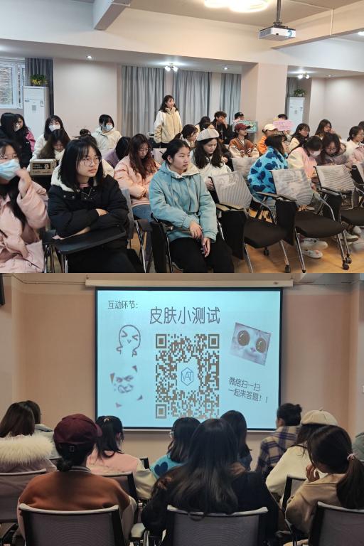 本次活动通过理论课与实践课相结合的方式分享美妆知识。对于初次接触化妆的同学们而言,理论课程更偏向于帮助化妆新手们全方面的了解化妆的意义。黄小寒老师表示:“化妆不仅是为提升自身气质,增强自身魅力,更是为了取悦自己,获得自身满足感,幸福感。一个得体的妆容在各个方面都能获得增益效果。”后又带领着大家从化妆步骤、化妆正确手法、化妆产品、化妆工具等方面着手全面探讨如何拥有一个得体的妆容。