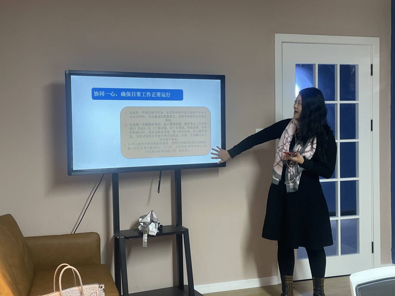 最后,公共教研室主任张旭宁老师做了公共外语的教学工作总结和计划,张老师强调,希望各位老师在授课中积极累积教学经验,在教学中成长起来。