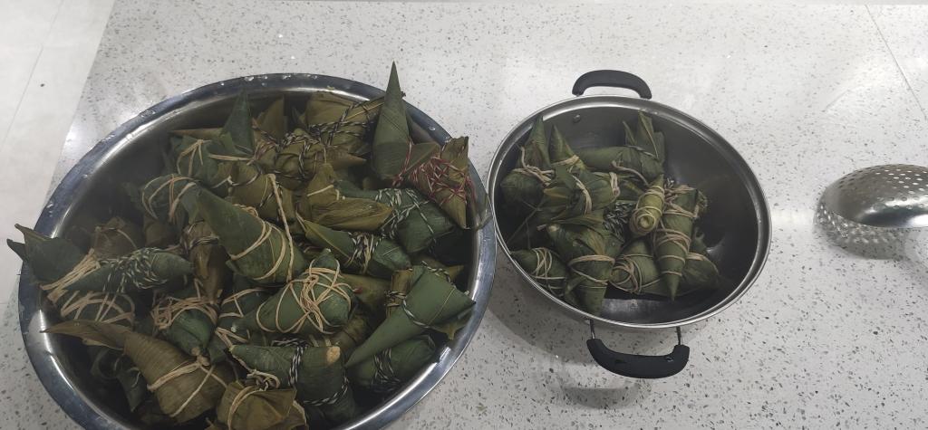 由于很多同学都是第一次包粽子,所以有大部分的粽子看起来“奇形怪状”的,即使这样也没有击退同学们包粽子的热情。看着自己的作品,同学们互相“吐槽”,在你来我往的言语中乐开了花,脸上露出了开心的笑容。时间过得很快马上到中午了,包粽子环节来即将结束,接下来就开始煮粽子,同时也让同学们先去食堂吃饭,留了个别同学在厨房看着煮粽子。