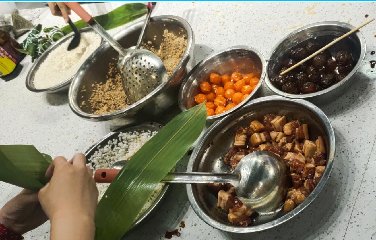 上午10点,同学们就开始热情的准备包粽子的材料,洗粽叶,准备粽陷等,准备工作结束后,同学们纷纷围在灶台周围开始学习包粽子。在有经验的同学和老师的指导下,同学们纷纷拿起粽叶,兴奋又认真地学习起了如何包粽子,折粽叶、填糯米、裹叶子、扎线……一道道工序有条不紊,忙得不亦乐乎,厨房充满一片欢声笑语。不一会儿,一个个饱满的三角粽子、四角粽子就包好了。