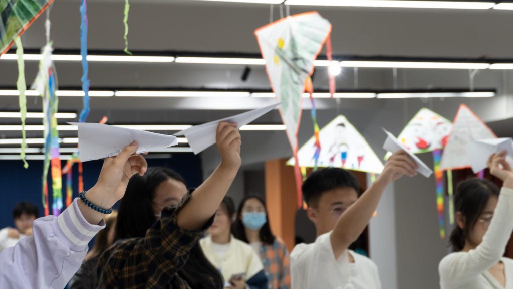 4月13日下午,在綦河书院一号楼晨钟·文化展厅进行了“向往的生活·书院”(第1期)——“无限飞行,纸飞机计划”。活动现场的气氛十分活跃,同学们纷纷把自己的烦恼写在一张纸上,把这张带有烦恼的纸折成漂亮的纸飞机,让纸飞机载着烦恼飞走,从而完成压力释放。