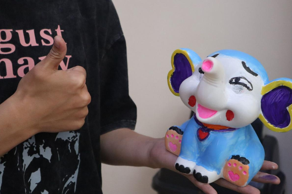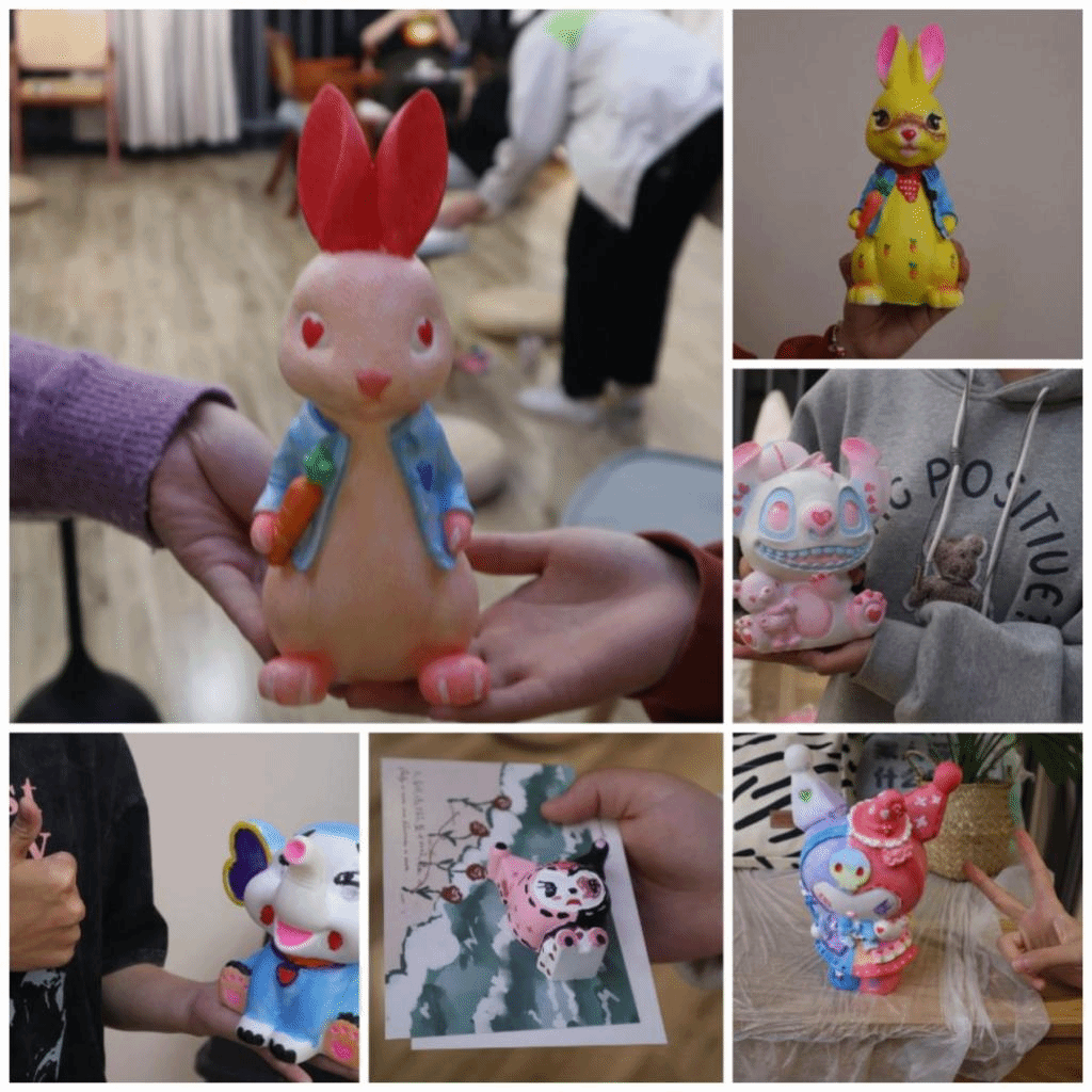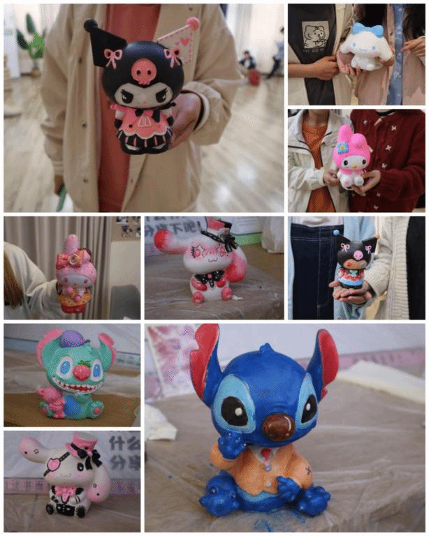 “姐妹,快看他们的巴嘎象,笑发财了”,欢声笑语萦绕其中。温馨的灯光,静止的石膏,在一笔一笔的勾勒中,充满了创造力和天马行空的想象力。今天,同学们化身为小画家,细致地勾勒线条,用自己最想呈现的色彩填补空白,绘出迥异不同的、独爱的,栩栩如生的、创意十足的卡通形象,与个人风格鲜明的娃娃一起在这场彩色盛宴中收获快乐。