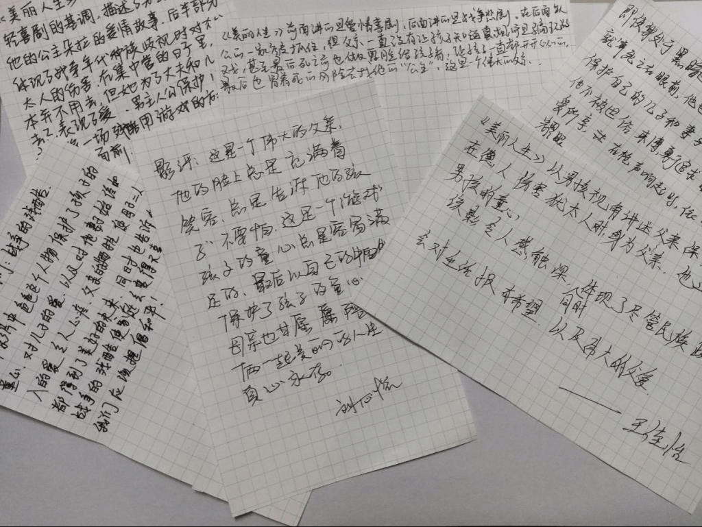 观影结束后,同学们通过采用书写简短影评的方式,对这部影片进行了分析和评价,用文字回应着影像,在发展同学们观影兴趣的同时也能够有利于提高当代大学生的欣赏水平以及审美能力、思辩能力,深入地去体验生活,从而间接促进电影艺术的发展。