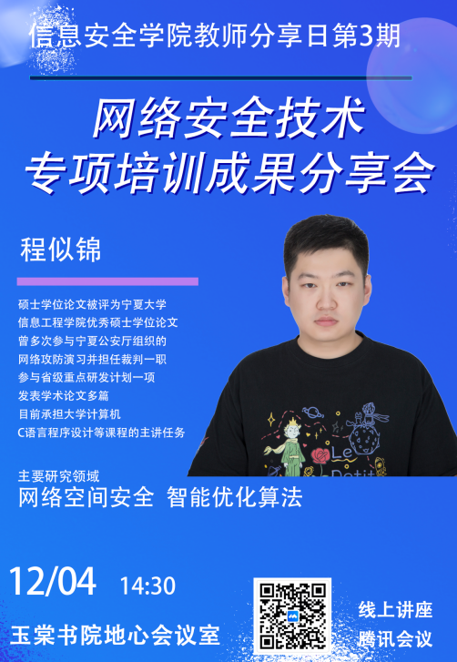 培训分享、交流研讨、经验共享,既是播种的过程,也是沉淀收获的过程。为了让团队成员能够相互取长补短,促进思维融合,弥补自己知识盲区,增加兴趣点,扩大培训受益面,使团队成员人人会分享懂分享乐分享,信息安全学院特推出“教师分享日”系列教研活动。现已推出第0期“互联网+创新创业大赛备赛经验分享活动”、第1期“远景百万奖励基金”示范课分享会、第2期“新工科背景下人才培养方案和课程建设”等分享会。第3期分享会于2022年12月4日下午14:30在玉棠书院地心会议室举行,主题是“网络安全技术专项培训成果分享会”,由信息安全学院程似锦老师进行分享汇报。