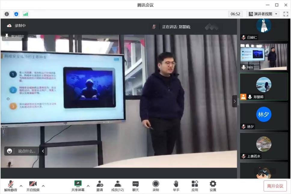 本期分享会全面贯彻落实习近平总书记网络强国战略思想,加快网络安全人才培养,筑牢信息安全屏障,同时增强学院教职工的网络安全知识、提高网络安全意识、维护学校网络环境安全稳定。因疫情原因,本次活动采用线上线下相结合的模式进行,信息安全学院王宁院长携全体专任教师及部分学生代表参加了本次活动。