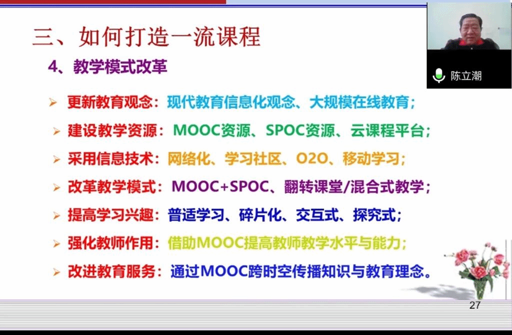 陈立潮教授就如何打造一流课程展开叙述,首先是教育模式需要改革:更新教育观念,需拥有现代教育信息化观念、大规模在线教育观念;建设教学资源,例如MOOC、SPOC、云课程平台等;多采用信息技术、网络化技术,构建学习社区,O2O学习平台;改革教学模式,例如MOOC+SPOC,翻转课堂与混合式教学;提高学生学习兴趣,多采用普适学习、碎片化学习、交互式学习、探究式学习等方式;改进教育服务,通过MOOC跨时空传播知识与教育理念。陈立潮教授以《C语言程序课程为例》,引导教师建立“计算思维”与“问题求解”的教学理念,采用“案例驱动、提出问题、解决问题”的教学思路,把问题求解作为学习的出发点,带着问题学习语言。