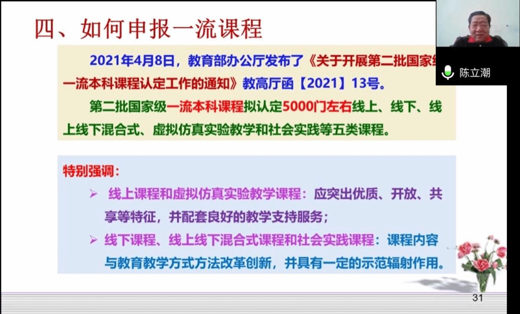 陈立潮教授就如何申报一流课程作了详细讲解,特别强调线下课程、线上线下混合式课程和社会实践课程,需要课程内容与教育方式方法改革创新,并具有一定的示范辐射作用,详细叙述了申报一流课程的基本要求、否决项目和评分指标。陈教授结合自身建设一流课程的经验,向老师们分享如何强化“课程思政”,一是把课程思政作为一流课程建设的重要内容,二是把专业教育与课程思政紧密结合,三是把育人工作落实到教学的全过程。