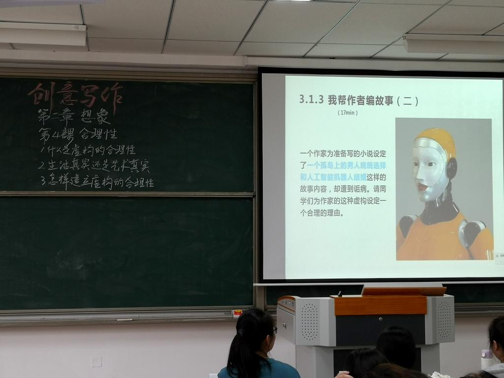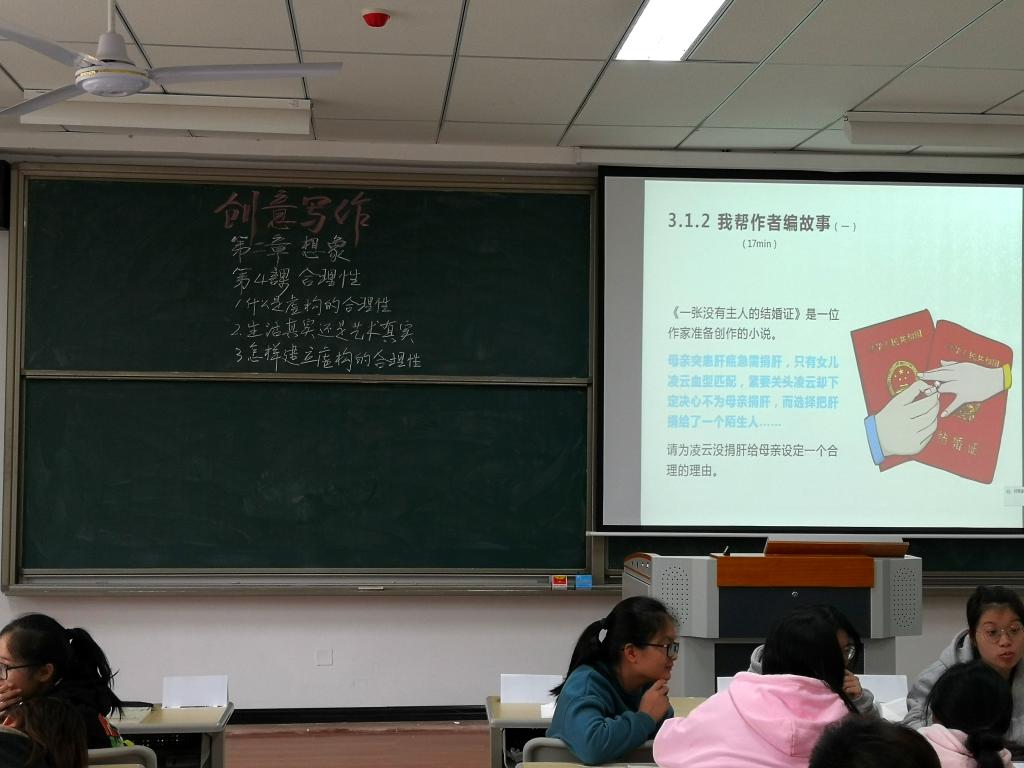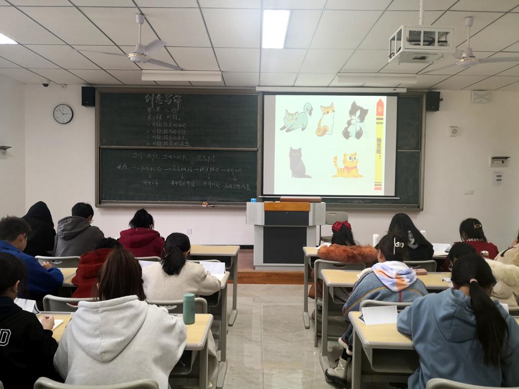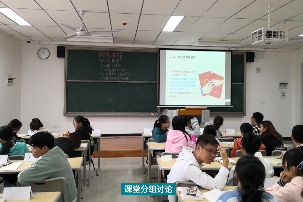 郭老师结合自身作家创作经验,把高度概括的浅显化的知识点讲授与课堂分组讨论、课堂练笔、课堂分享、课后阅读等多种手段结合起来的教学模式,成了我们创意写作课堂的常态,我们尽情地遨游在想象的世界中。在乐趣中学习,总觉时间过得飞快,一晃就即将完成《创意写作》的一半课程。