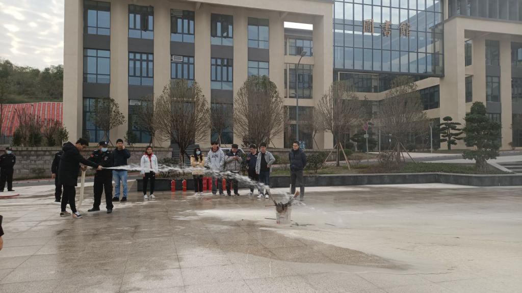 在保卫处谈胜老师、队长池俊老师、图书馆张正光老师、綦河书院刘岩老师的带领下,同学们开始了“实战”演练。池队长拿出消防水枪并一步步的向我们展示如何快速连接水枪与水带,在打开消火栓后,谈处长邀请大家使用消防水枪并谈到“要在演练中感受水枪的威力,提前适应,确保在突发情况中不慌乱不胆怯。”