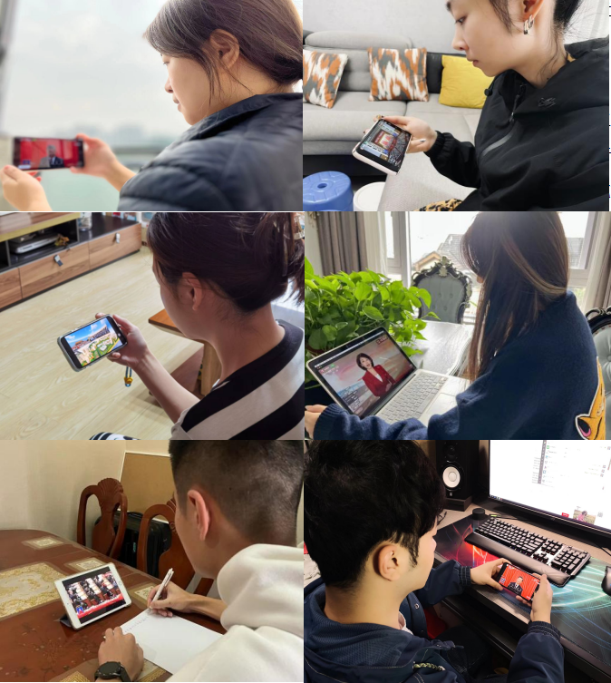 部分艺术教育中心教师、竞技体育中心教练以及书院发展导师在家里云观看,认真学习并做好笔记。