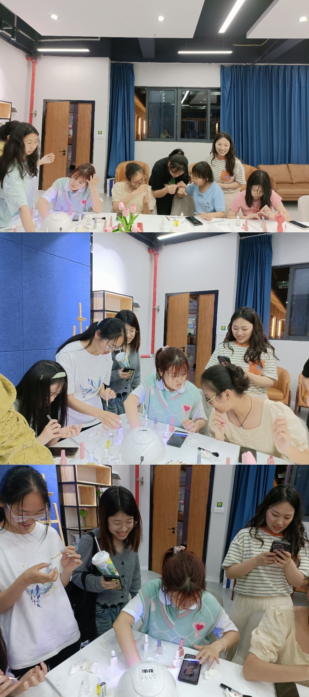 同学们互相观摩学习,认真描画,美丽在同学们的指尖绽放,现场欢声笑语,聊着各自的喜好。在轻松愉悦的氛围里时而听到个别同学的感叹声,平日的压抑都在美甲DIY中得以释放。