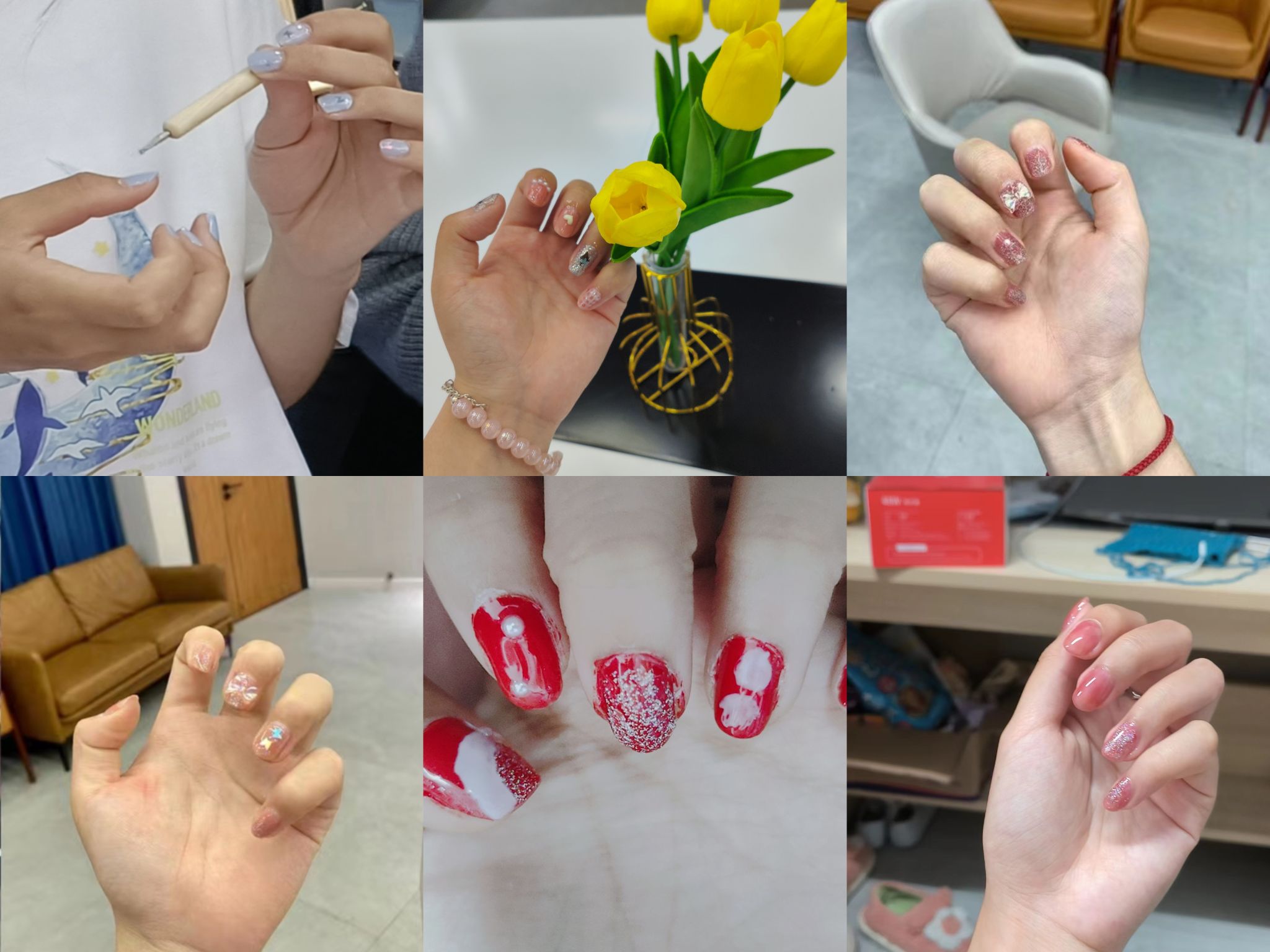 美甲让指尖的艺术顿时变得新颖立体,仿佛一抬手就是一场指尖魔术,经过同学们自己的精心设计创作,别致的美甲DIY新鲜出炉,各种风格的美甲或淡雅、或梦幻、或活泼,如一个个音符悦动在指尖,赏心悦目。