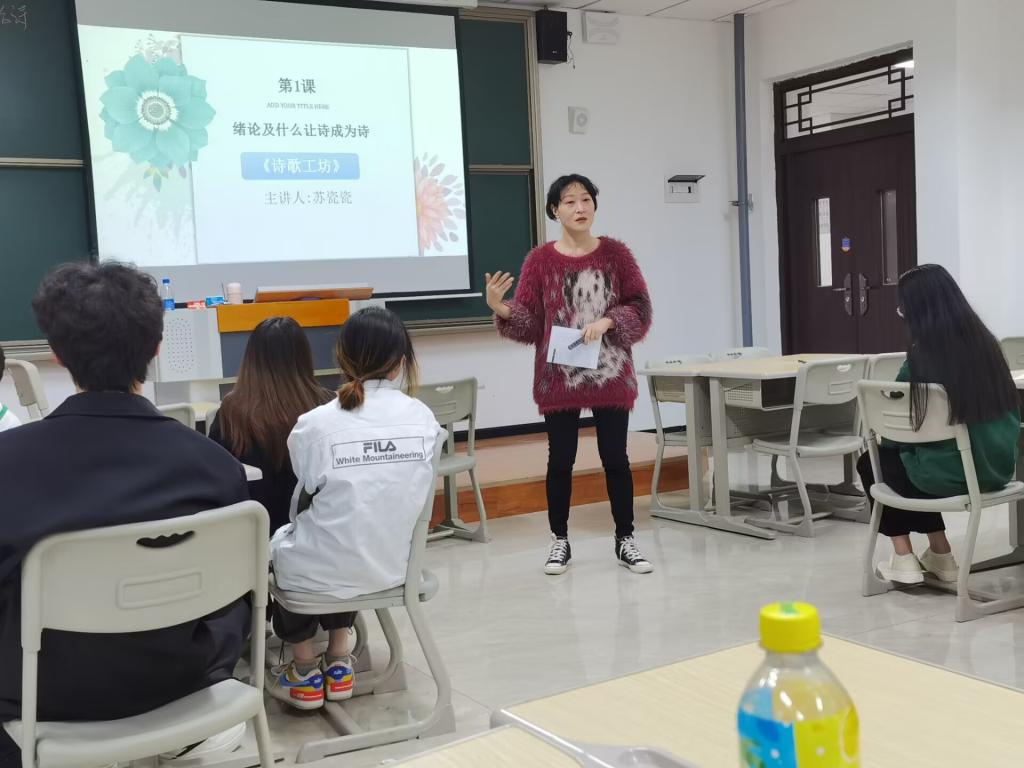 小说工坊的诗人、创意写作学院副院长苏瓷瓷老师也于本学期走进诗歌工坊的讲台,第一堂课,让同学们围绕“诗对我们到底意味着什么”进行思考,对大家来说,它或许是一种精神寄托,或许是一种柔情的回忆,亦或是我们对生活情感的表达,但一切都归结于对它的热爱,而诗的意义,也会随着对它更深入的理解变得更丰富。