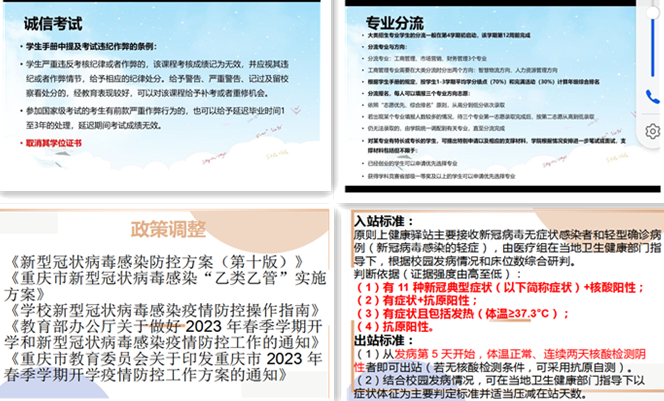 在疫情防控方面,辅导员老师们一方面对《新型冠状病毒感染防控方案(第十版)》、《重庆市新型冠状病毒感染“乙类乙管”实施方案》、《学校新型冠状病毒感染疫情防控操作指南》等疫情防控政策以及《重庆移通学院健康驿站管理方案》进行解读,对綦江校区健康驿站“入站、在站以及出站”等程序进行了梳理,一方面要求同学做好自我健康监测,预防感染或者二次感染,做好自己健康第一责任人,同时及时反馈报送相关数据。