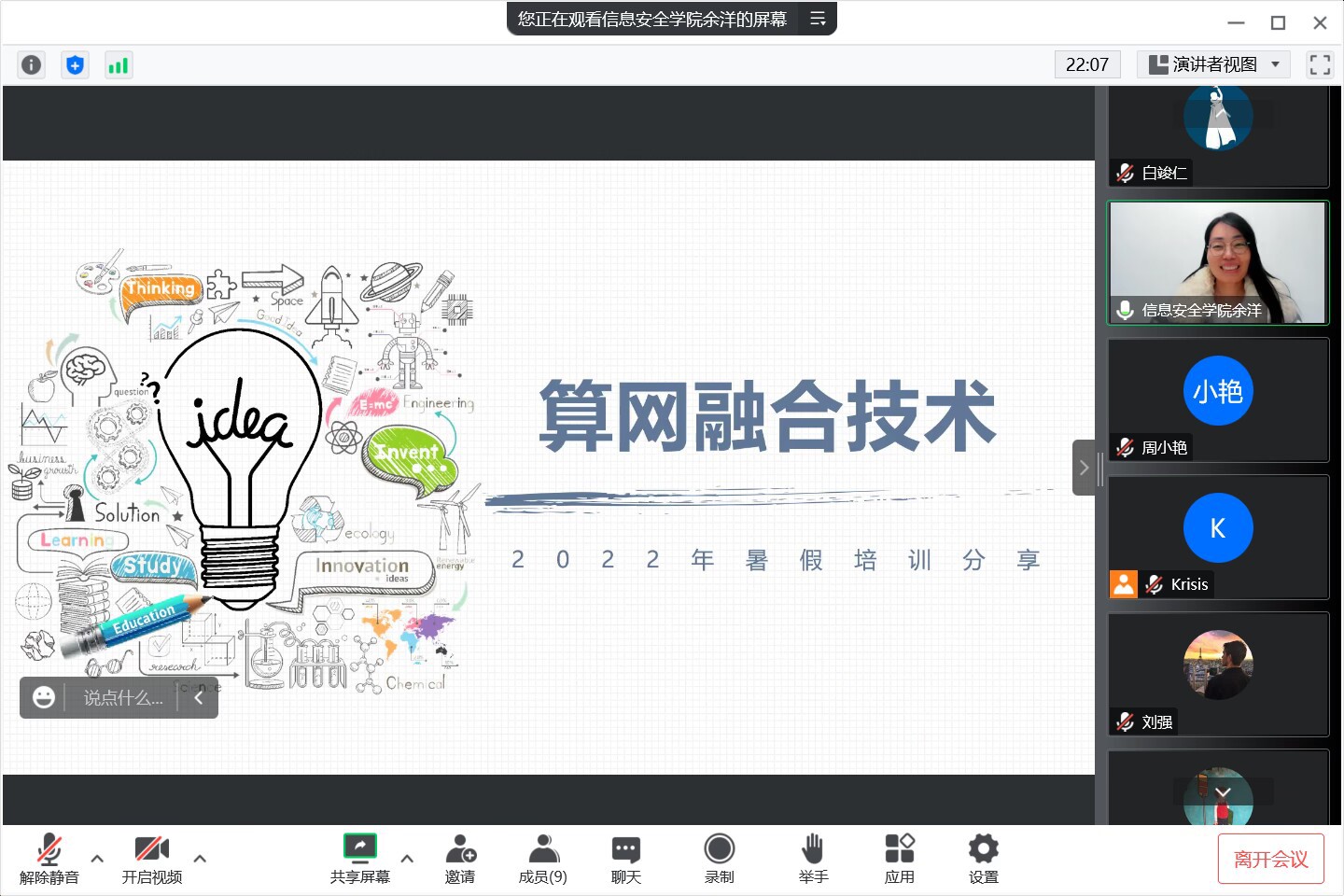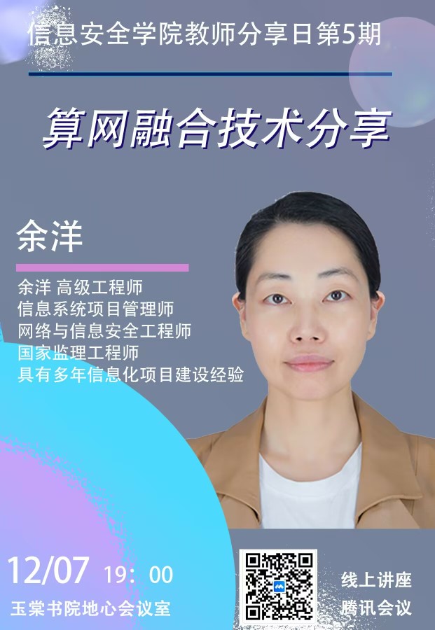 培训分享、交流研讨、经验共享,既是播种的过程,也是沉淀收获的过程。为了让团队成员能够相互取长补短,促进思维融合,弥补自己知识盲区,增加兴趣点,扩大培训受益面,使团队成员人人会分享懂分享乐分享,信息安全学院特推出“教师分享日”系列教研活动。现已推出第0期“互联网+创新创业大赛备赛经验分享活动”、第1期“远景百万奖励基金”示范课分享会、第2期“新工科背景下人才培养方案和课程建设”分享会、第3期“网络安全技术专项培训成果”分享会、第4期“区块链技术”分享会等。第5期分享会于2022年12月7日晚上19:00在玉棠书院地心会议室举行,主题是“算网融合技术分享会”,由余洋老师进行分享。