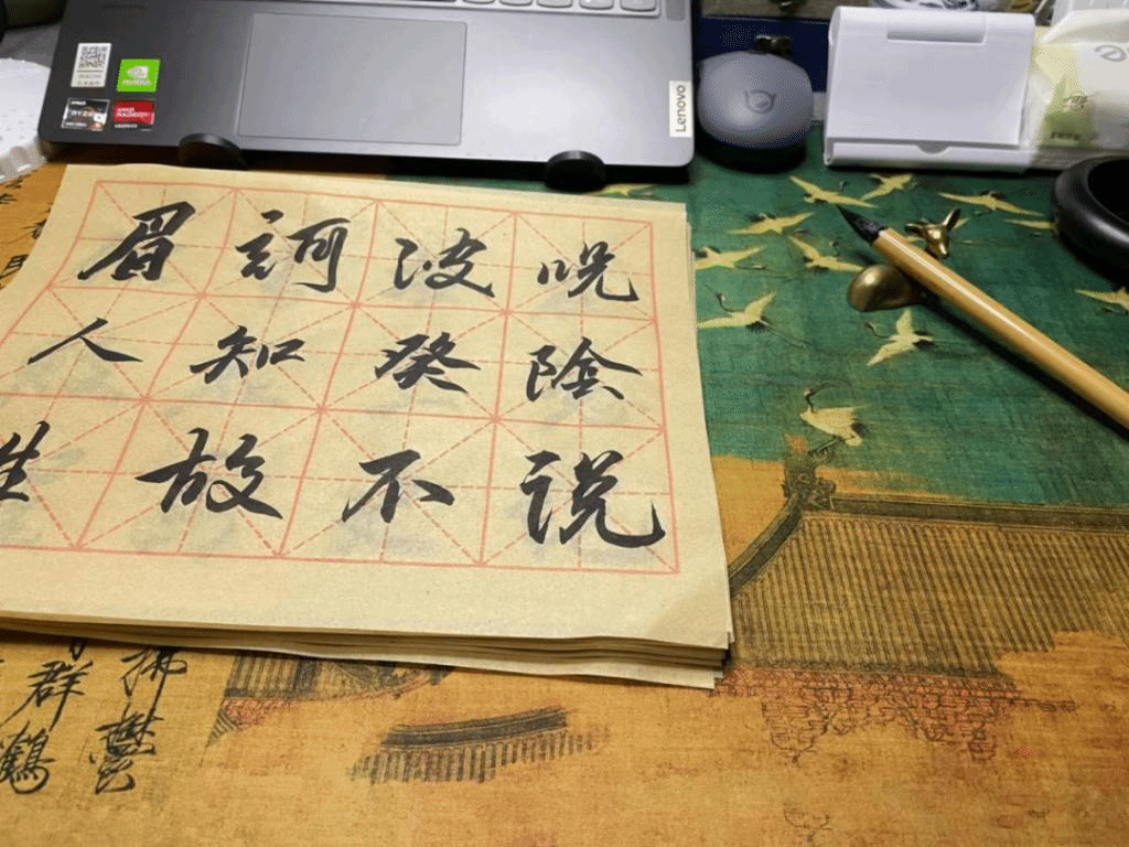 寝室的一角,一支笔,一沓纸,写尽世间温柔。沉浸在书法的世界里,任墨色云卷云舒,不变的依旧是无悔的青春。