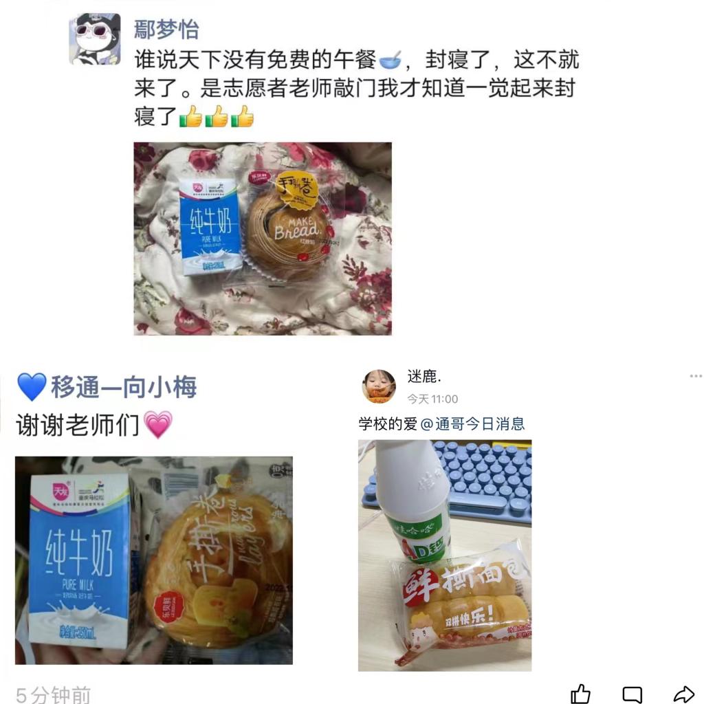 “我睡醒就收到了老师们送的早餐,谢谢老师!”“很早就听到老师们送早餐的声音,已经到每间寝室了,老师志愿者们辛苦啦!”