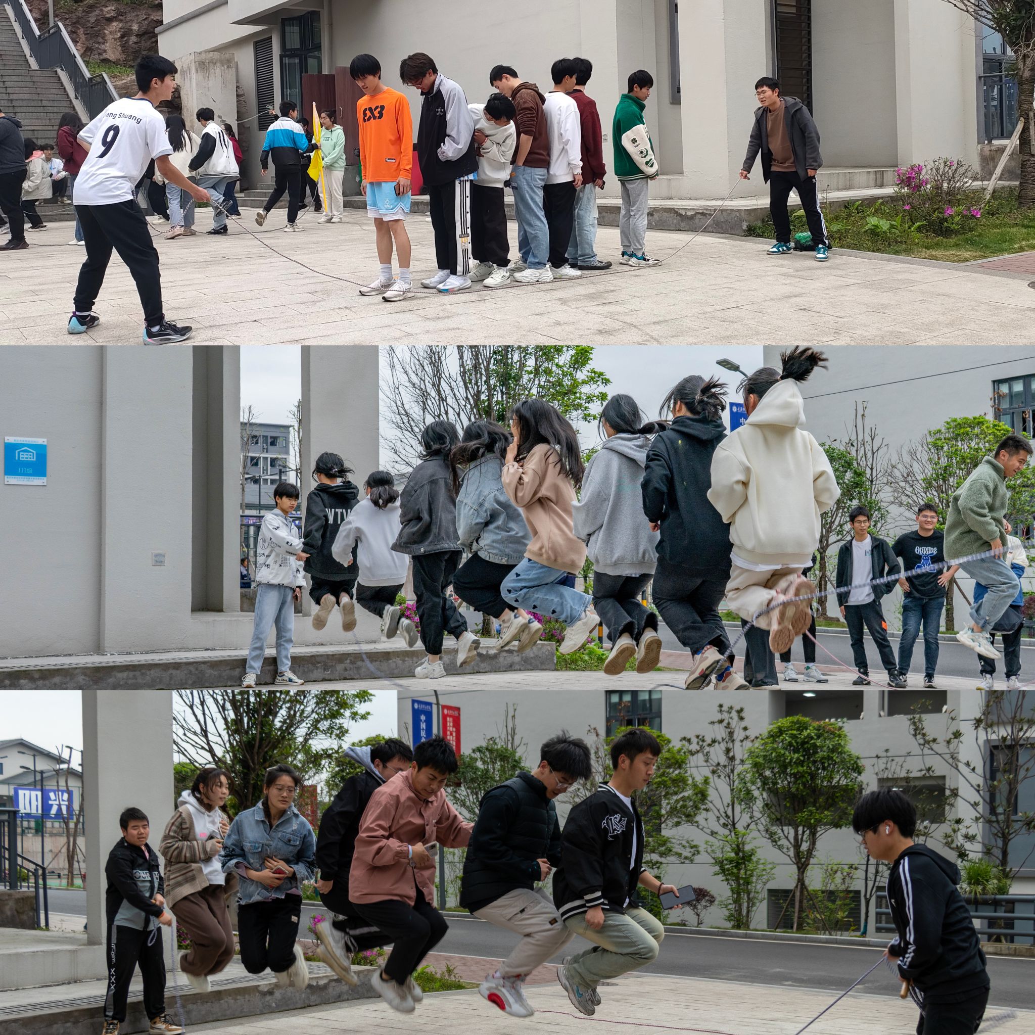 在团队跳长绳过程中,同学们按照事先练习的队形排列整齐,奋力起跳,默念节奏,彼此之间默契十足。随着长绳的上下翻飞,参与者们在长绳中间灵巧跃过,队形整齐,动作连贯,促进了团队协作,展示了参与者的青春与活力。