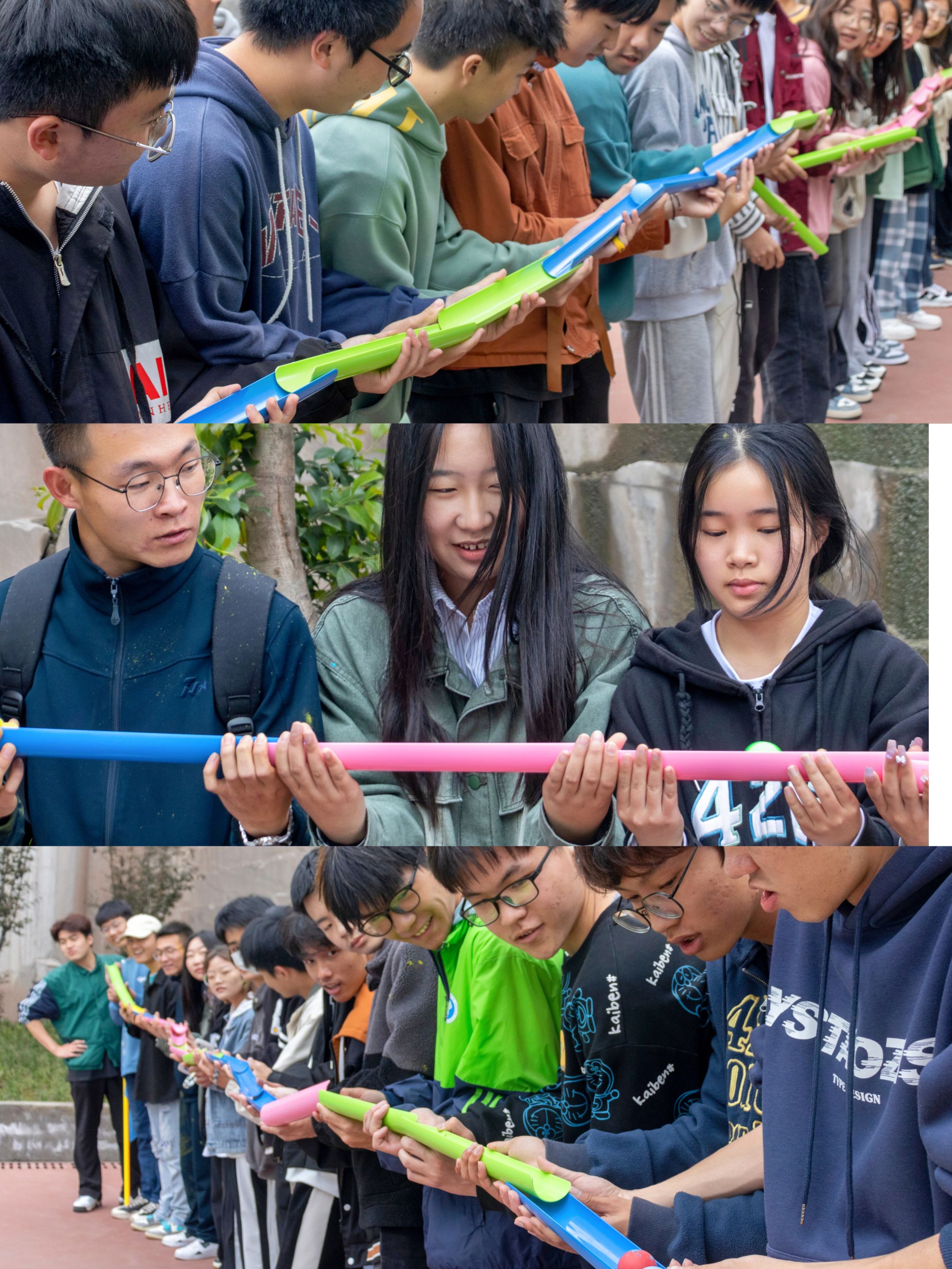 乒乒球传递过程中,每位队员通过分发的PVC管连接形成通道,在起点处放入乒乓球使其通过PVC管到达终点放置的杯子内,游戏过程中保证乒乒球不落地且不用手触碰球即为完成任务。活动过程中,同学们相互配合,小心谨慎,成功完成挑战,深刻领悟到了伟大集体的力量。