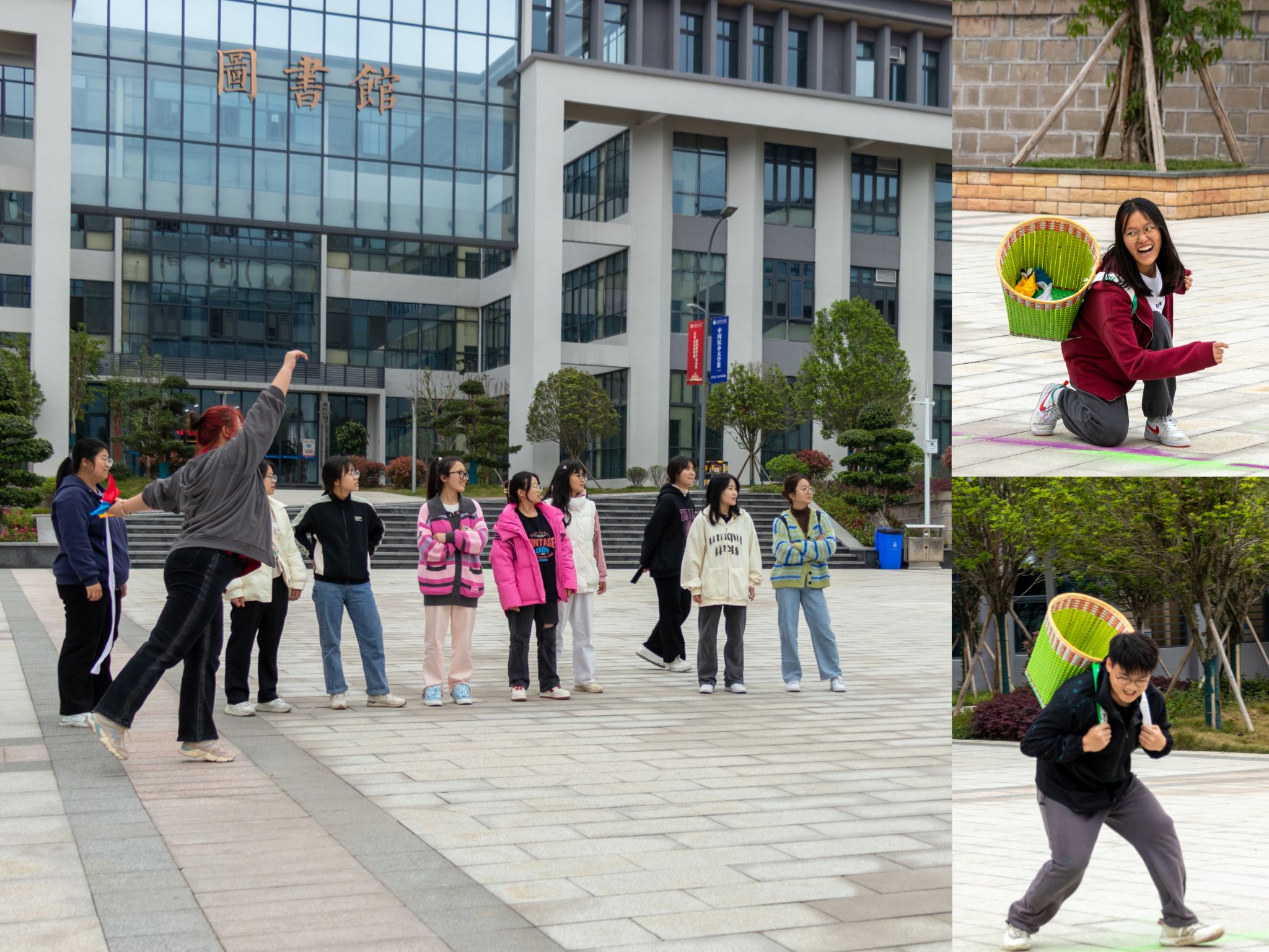 在开始接绣球前,同学们都积极投入到拋绣球的练习中,寻找双手熟练度以及队员之间的默契度。随着工作人员的一声令下,拋球者左手向前上方伸直,用四指托住绣球,右手拉住绣球提绳尾部,向前抛出,绣球在半空中划过一道靓丽的风景线,背篓者对抛过的绣球走向进行预判,或半跪、或侧身、或跳起,不断变换姿势灵活接住五颜六色的绣球,展示了参与者的灵敏与坚毅。
