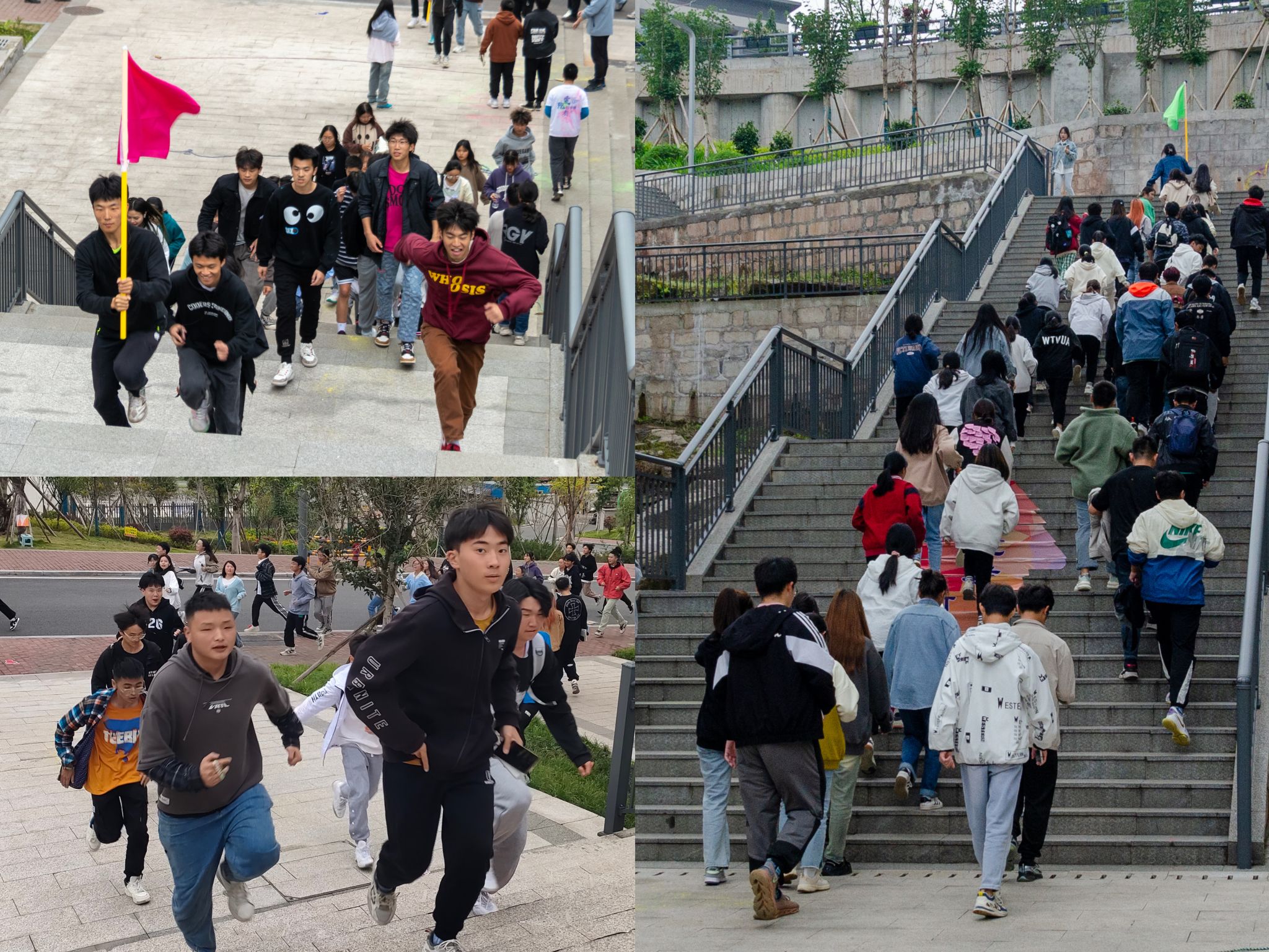 本次彩跑挑战赛以团队形式参赛,活动总共分为三条路径,参赛者现场进行分队,30人为一队进行参赛。三条路线融合校内地形优势,贯穿校园。行径路程中,将楼梯攀登与趣味活动相集合,为参赛者设置了不同的趣味游戏,分别是跳长绳、乒乓球传递、集体抛绣球。此次以集体参加的攀登和趣味游戏大大增强了同学的集体意识和团队精神。