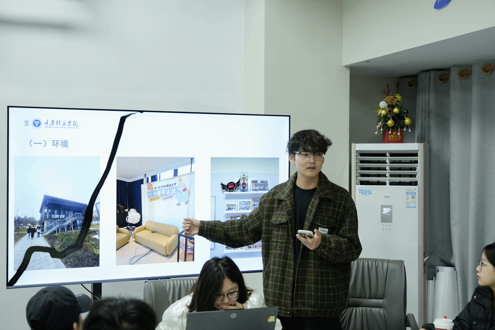 学生主席夏黔渝先对泰科交流作出总结。他围绕抖音运营、直播活动开展以及审美塑造等多方面展开阐述,深入剖析了当前我校在相关领域中存在的问题,并针对性地提出改进措施。夏黔渝着重强调,学生创作的作品应以宣传学校形象为核心导向,同时要具备舆情风险意识,巧妙避开舆论争议焦点。