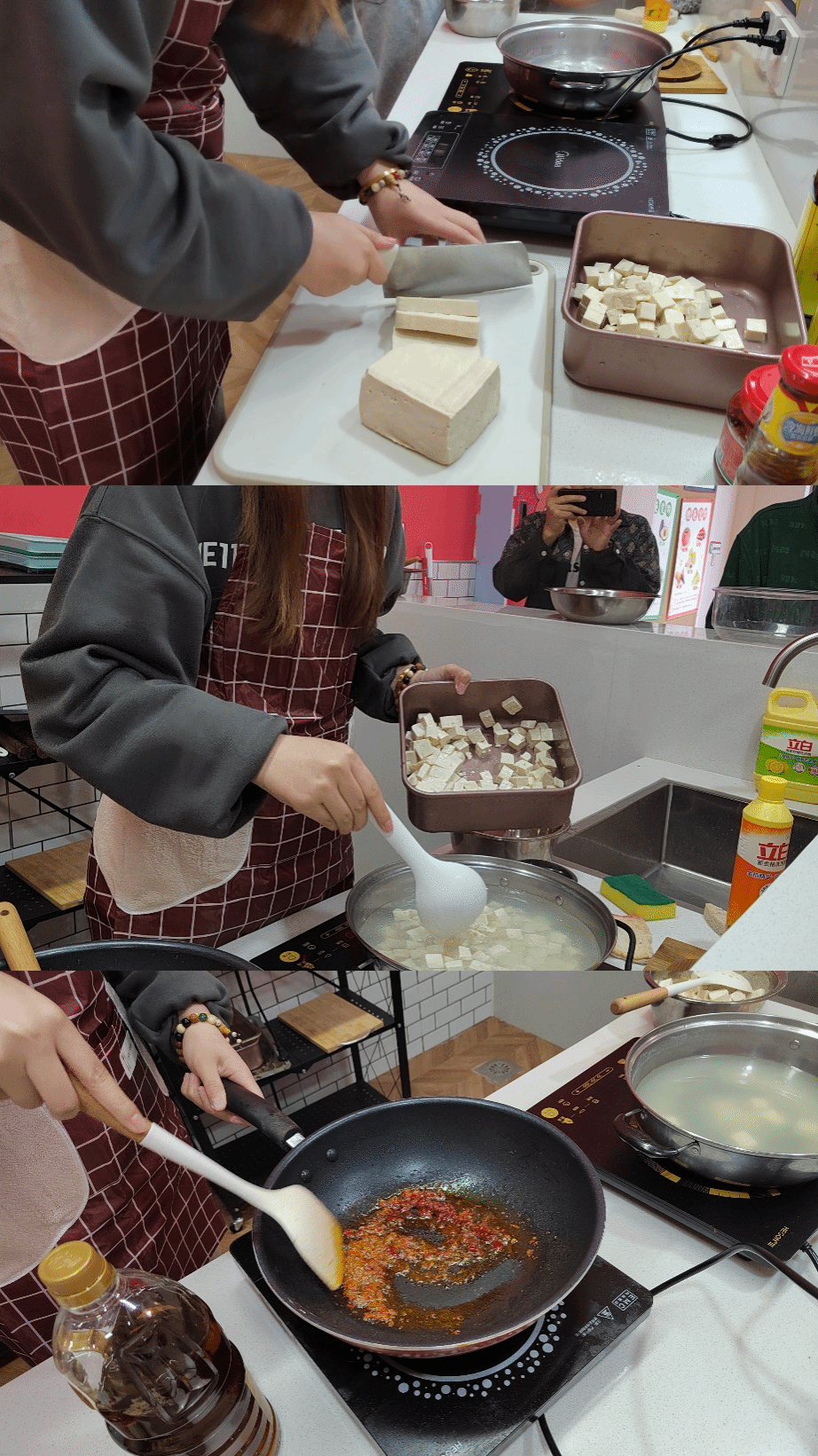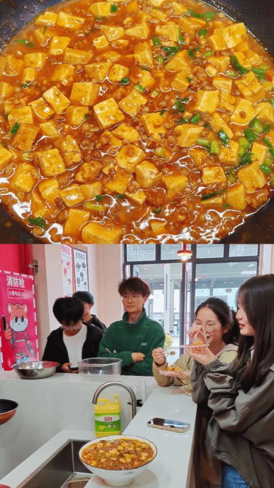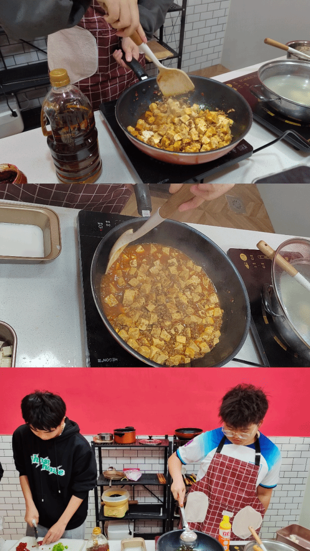 惟有美食与爱不可辜负!食物流变的历史无比漫长,但它承载的是一个个步履匆匆的身影,时代更迭,人群聚散,总能在食物中得到印证。正如麻婆豆腐的历史一般,经历过岁月漫长,却仍不失其鲜香美味。小厨房里弥漫着浓浓的辣椒味,有的同学忍不住打了喷嚏,现场充满着欢声笑语。最后一步将豆腐滑入锅中翻炒均匀裹上浓浓的辣椒油,盖上锅再焖煮一会儿,翻滚着的红油,蒸腾的热气,我想这就是所谓的烟火气吧!看似短暂的等待对于同学们来说莫过于最大的煎熬,用锅铲翻动一下,大火收收汁,便可以出锅了。同学们纷纷围上来品尝这一美味,豆腐在嘴里翻转滚动,辣椒和香料的奇妙相遇,是味蕾和神经的碰撞。环顾四周,有的同学吃的津津有味,有的同学吃红了脸,还有的同学说“我可以吃三碗饭!”同学们也纷纷加入烹饪麻婆豆腐的队列,切菜的,切豆腐的,热油锅的,大家齐心协力,按照小老师的步骤也很快成功的做出了麻婆豆腐,味道同样鲜美。看着同学们脸上洋溢着因美食而幸福的笑容,一切辛苦都烟消云散了!