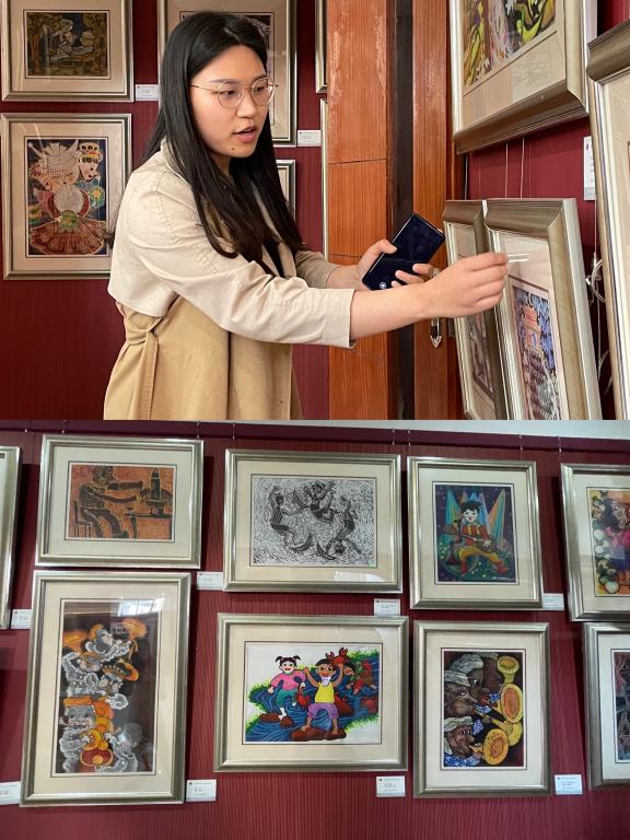 师生们在张艺千绘声绘色的解说下,看着惟妙惟肖的版画不禁驻足停留观赏、各抒己见,气氛其乐融融。