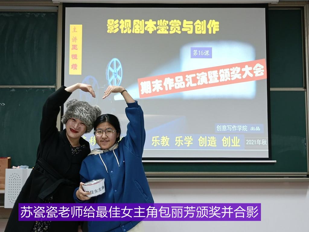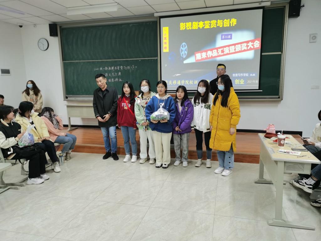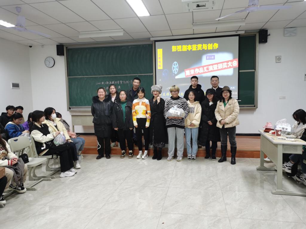 13日晚上,仁者楼412教室,《影视剧本鉴赏与创作》正在进行结课作品汇演暨颁奖大会,9个小组依次上台展示自编自导自演的作品,来自创意写作学院的四名评委老师,一边认真观赏,一边录像摄影,并打分。经过四节课的PK,最终决出团体一二三等奖9项,个人单项奖3项。
