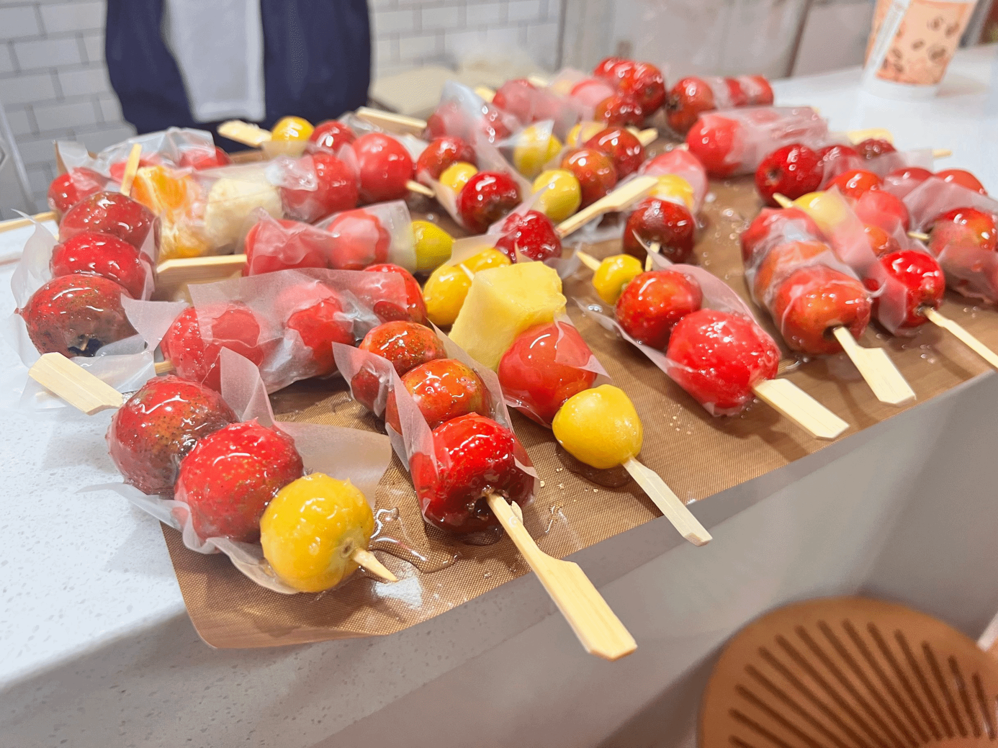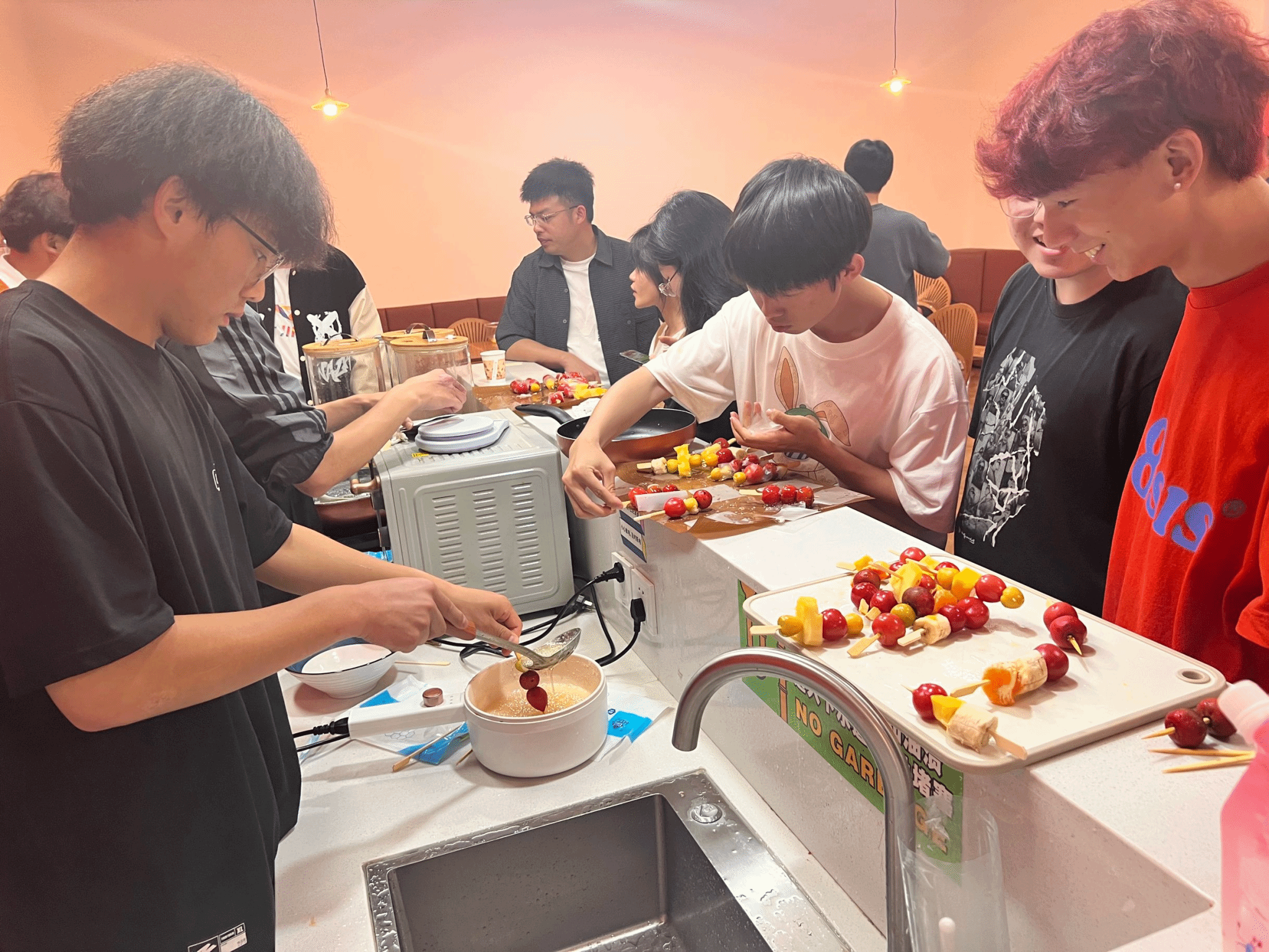 冰糖葫芦源于南宋时期,百姓用竹签将其穿起来吃,像一个小小的葫芦,因葫芦与“福禄”相似,得名冰糖葫芦,且不说冰糖葫芦有开胃、养颜、清热等作用,光从同学们的笑脸上就可以看出制作冰糖葫芦的过程有着消除疲劳、缓解心情的益处。一些同学负责熬糖,一些同学负责穿串,一只手拿住竹签,挑选自己喜欢的水果,去籽,并用心地将水果串到竹签上,此刻,同学们仿佛“自觉此心无一事,小鱼跳出绿萍中”。