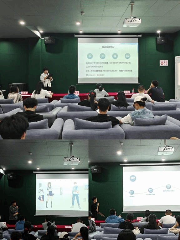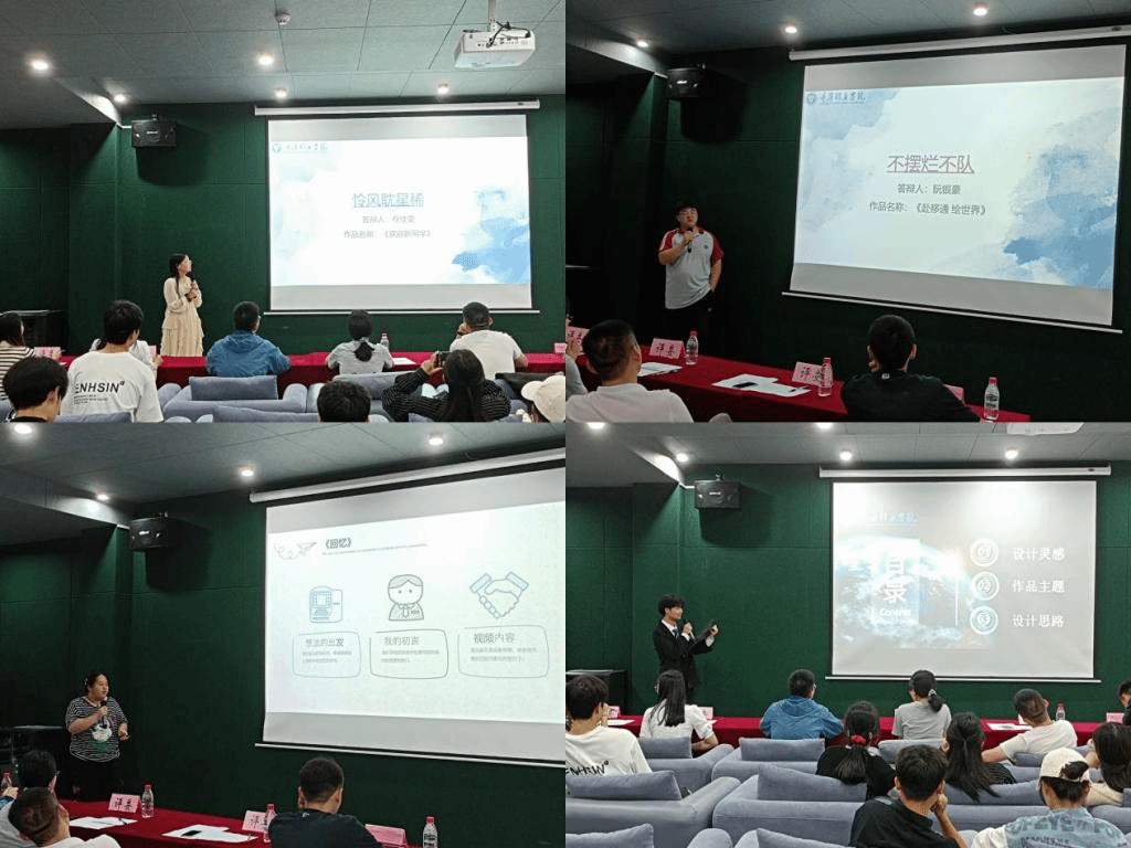 “‘欢迎新同学’是我们以学校元素设计的海报,书签以及视频。”“我们的设计灵感来源于我们的生活,我们在生活中所看的蔚蓝的天空,学校的校训……”参赛选手们为老师和同学们讲解了自己作品的设计思路和灵感。“参考了多个影视作品寻找灵感,拍摄了500多个G的视频素材,600余字的文案撰写……运用了多个视频制作软件在历时82个小时得到了最后两分钟的视频……”“我们根据自己的优势,选择了不一样的切入点,我们根据学校的特色教学和办学理念,设计了两个动漫人物和一些周边……”每个队伍讲解了自己的初衷,灵感来源以及在创作中遇到的问题和困境,但都克服并得到了一个好的成果。