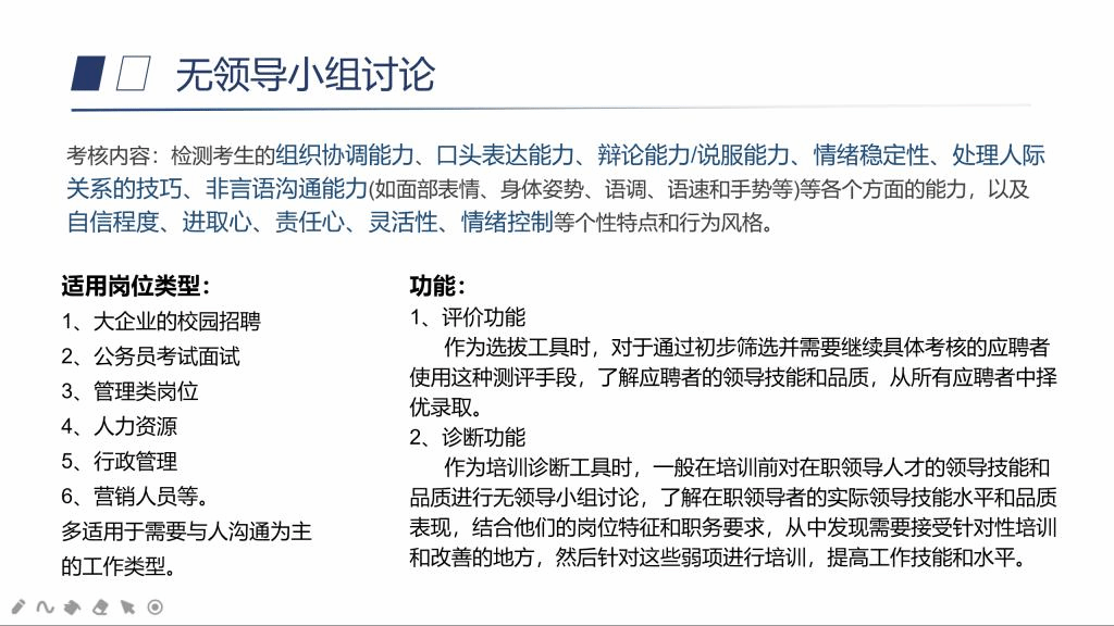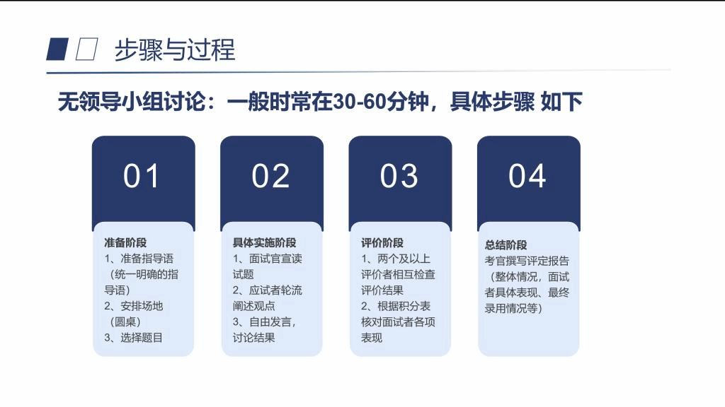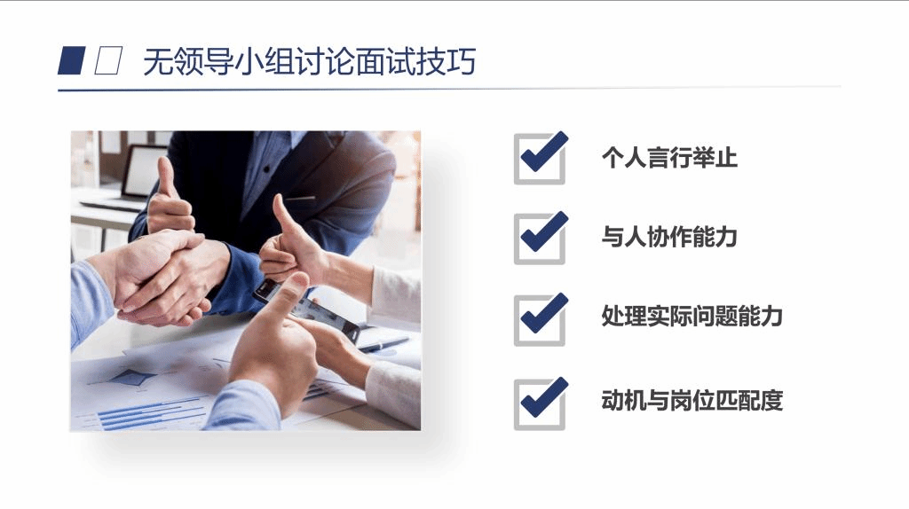 随后,陈锐老师对无领导小组讨论面试注意事项和技巧进行了详细的介绍。她指出,良好的言行举止、高效的协作能力、出色的处理问题能力、合理的动机与岗位匹配度是无领导小组讨论的关键点。同时,老师从考官评分标准来入手,介绍了一些“加分项”和“减分项”:一、在个人陈述和自由发言中要实时记录,勇于发言,抓住问题的实质。二、认真倾听他人发言,不能过于强势张扬,适时停止给他人发言机会。三、发言内容要贴近主题,切勿刻意标新立异,导致偏离主题。