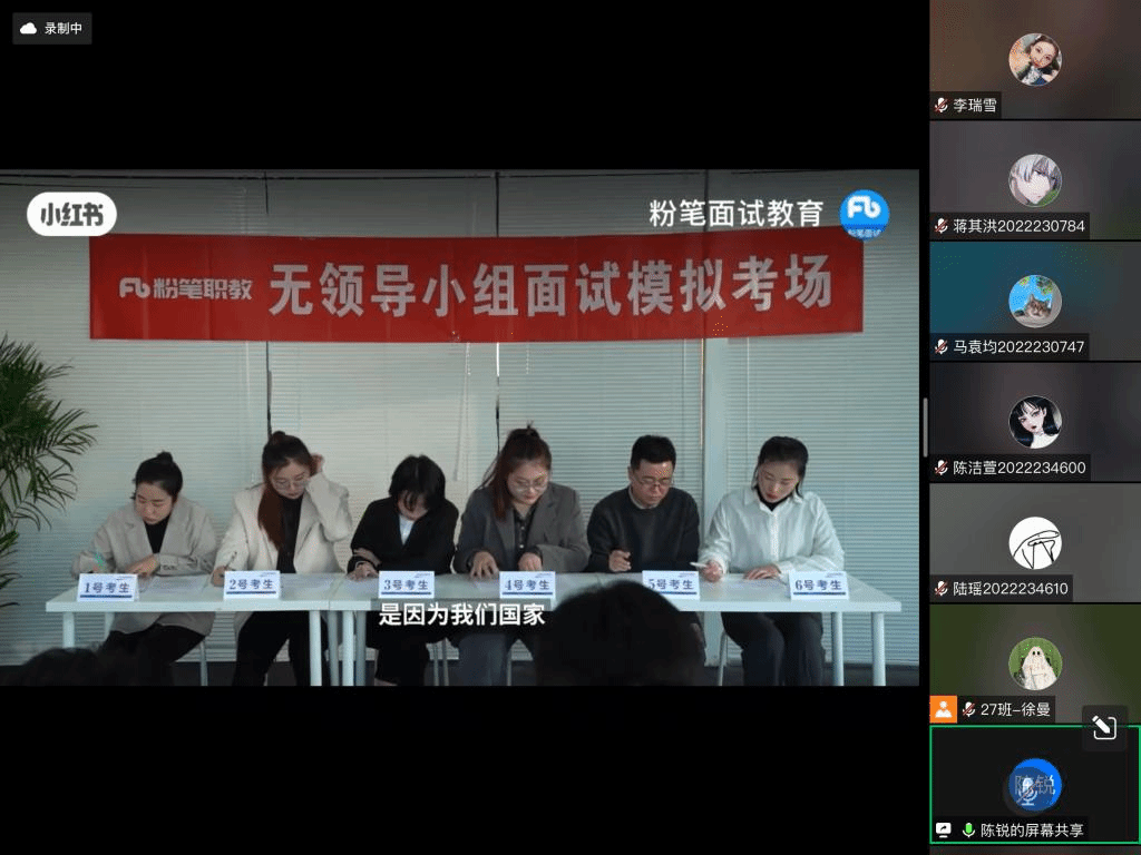 通过老师的讲解,同学们对无领导小组讨论有了系统且充分的认识。为帮助同学们更直观学习如何具体统筹安排一场讨论,陈锐老师通过播放真实面试视频的方式,让同学们“走进”考场。同学们通过观看视频,根据视频中面试者的表现,更有针对性地弥补自身短处,发扬长处。