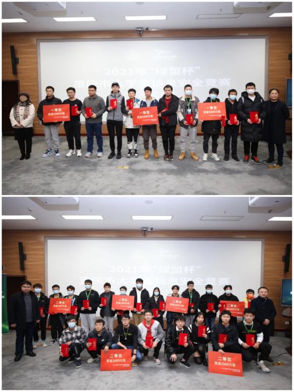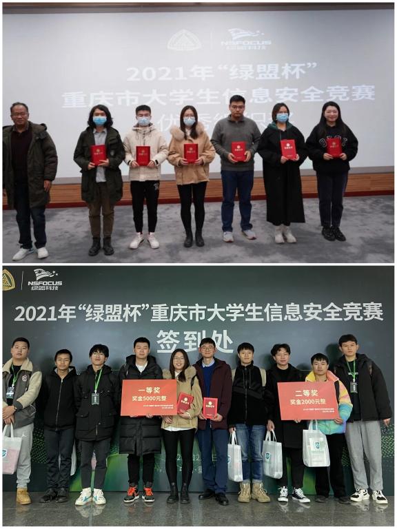12月4日,由中共重庆市委网络安全和信息化委员会办公室、重庆市通信管理局指导,重庆市通信学会、重庆市互联网协会、重庆市信息安全协会、重庆商用密码行业协会、重庆信息安全产业技术创新联盟主办的2021年“绿盟杯”重庆市大学生信息安全竞赛在重庆邮电大学落下帷幕。我校双体软件精英产业学院代永亮老师指导的n0tf队和信息安全学院周小艳老师指导的l1ch队,历经5个小时的现场决赛奋战,最终分别荣获决赛一等奖和二等奖。重庆移通学院也获评 “优秀组织奖”。