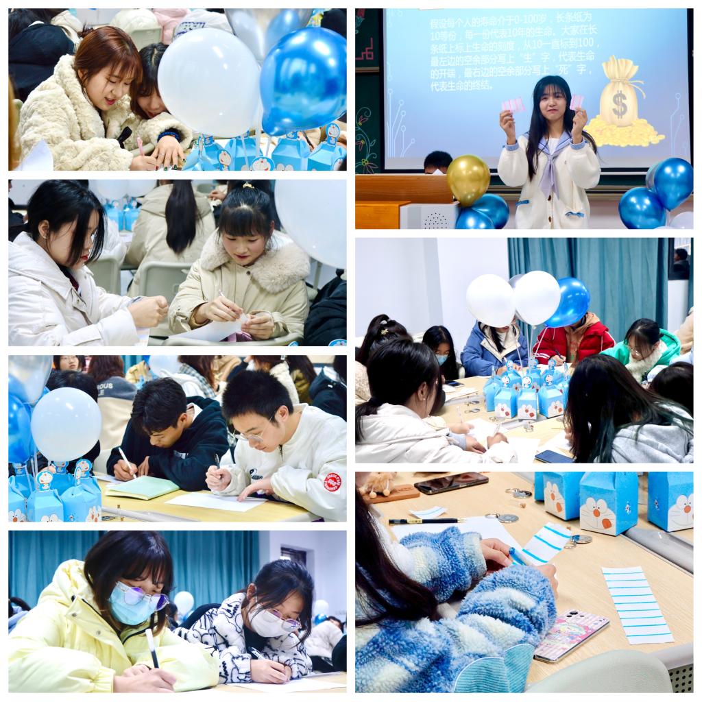 时光如梭,立足当下,砥砺前行。为让同学们更加形象地感受到时光流逝如流水,主持人带着大家开展了两个直观小游戏。提前准备好的10等份长纸条代表人一生的10个“十年”时光,随着主持人一步步的问题引入,同学们各自撕下过往、退休时光以及吃饭、休息、玩儿的时光,在手中能学习和工作的时间则所剩无几。鲜明的对比,让同学们明白看似漫长的一生,没有一分一秒能肆意挥霍!时间成本计算过程中,同学们计算了在校每节课、每小时、每分钟的学费花费,同时,还计算了每小时父母的收入。看着计算出的一组组数据,座位上的同学们微微颔首,陷入深深的思考当中……