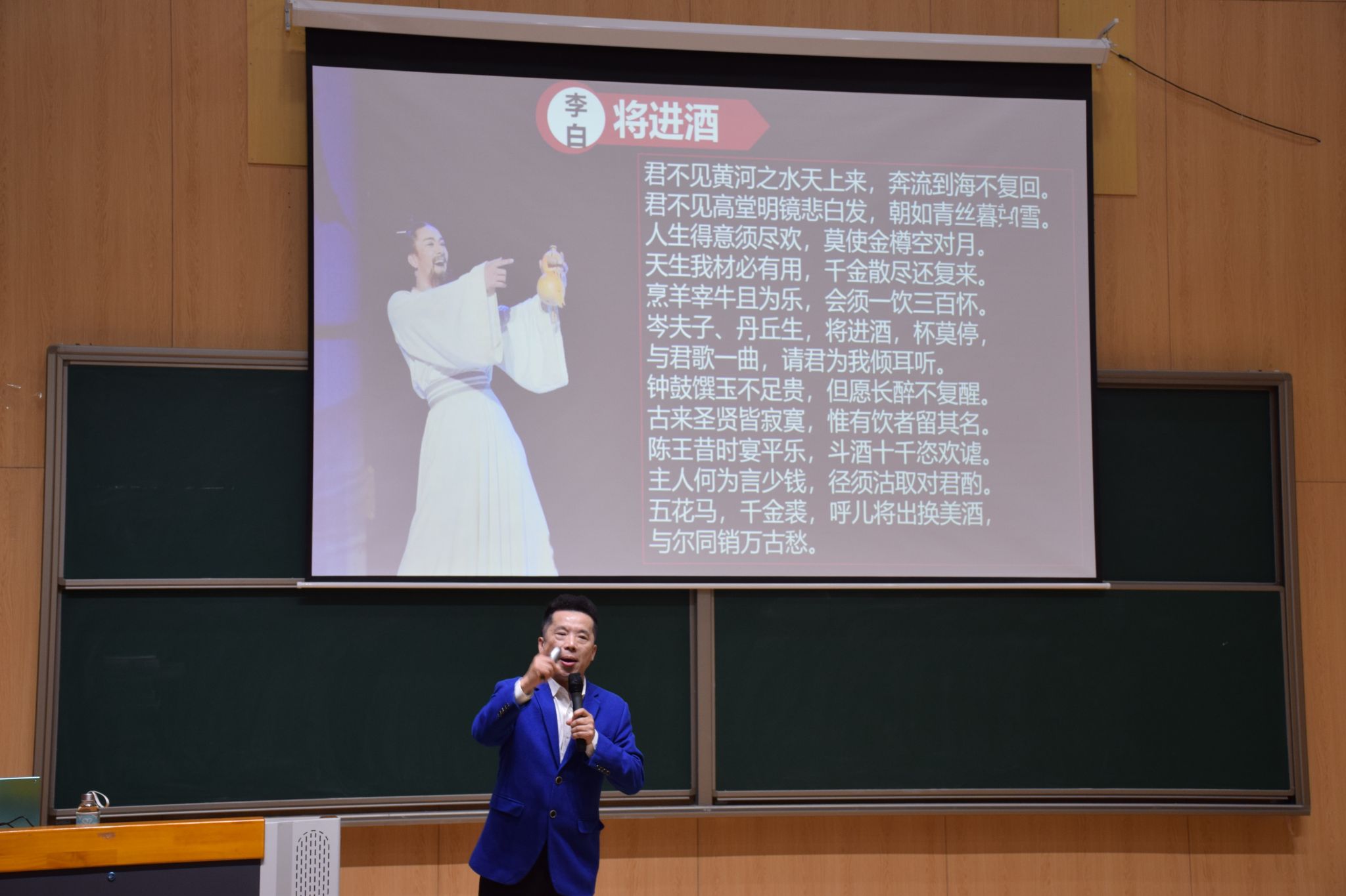 王老师趁兴朗诵了李白的《将进酒》,该诗气势豪迈,感情奔放,具有很强的感染力。王老师说,诗人心境在此是矛盾的,既表达了乐观、通达的情怀,也毫不掩饰地流淌着怀才不遇、及时行乐的消极情绪,但毫不妨碍它成为同题诗中的翘楚。