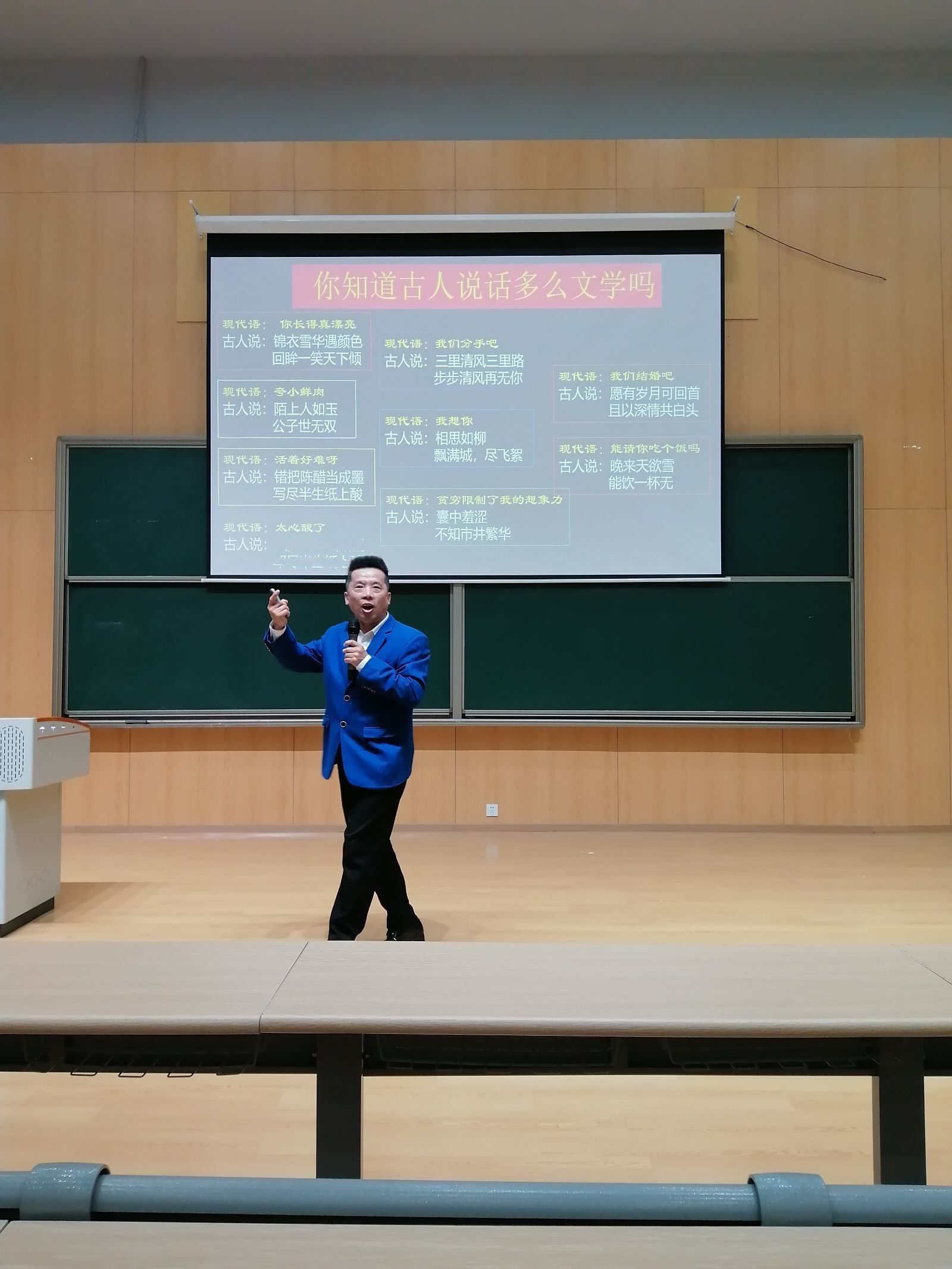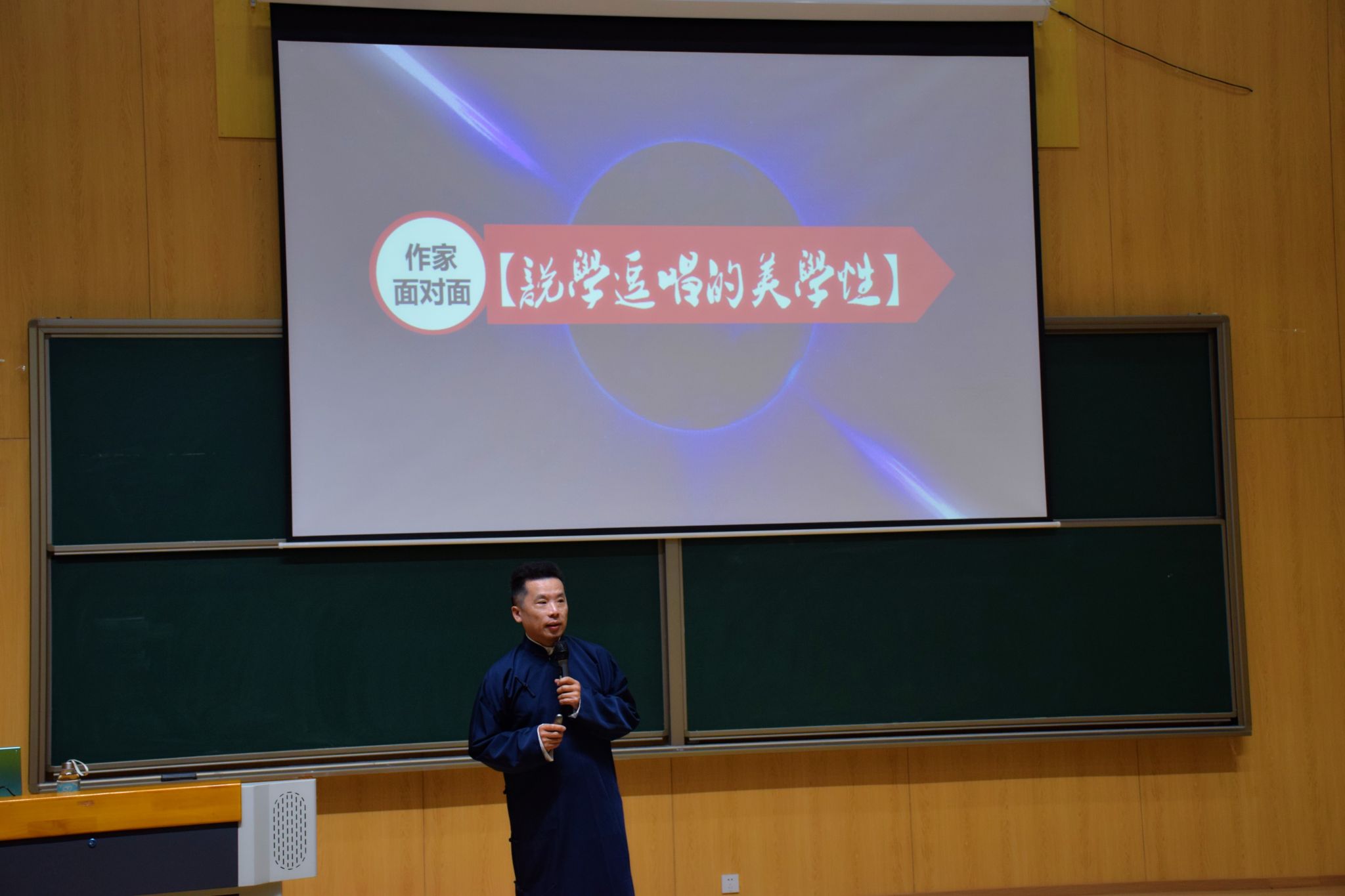 3月26日19时,春夜月如钩,很乖巧地挂在天幕上,静静地给校园添着清辉。在这“春色恼人眠不得,月移花影上栏杆”的夜里,綦江校区一百多位同学齐整整地走进了玉棠书院阶梯教室,创意写作学院王恒绩老师在这里主讲了一场文化讲座《当文学语言撞上说学逗唱》,可把同学们逗坏了。王老师一会儿西装革履,一会儿长袍马褂,一会儿唱歌,一会儿吟诗,一会儿唱戏,一会儿说相声……一场独角戏玩出了千军万马的感觉。这样的文化讲座很少见,一百多位同学自始至终都在亢奋之中尽情享受。