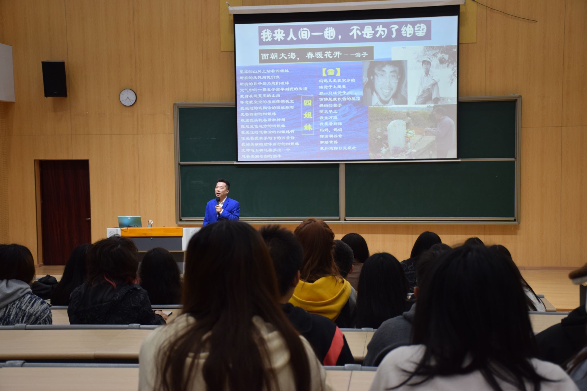 “面朝大海,春暖花开!”所有同学齐声高喊,喊得热泪盈眶。因为,今天刚好是诗人海子(查海生)去世34周年的忌日。王老师动情地讲述着海子的生前身后事,在背景音乐的绕梁中,他吟诵了海子的多首诗词,全场的文学氛围迎来第一个小高潮。