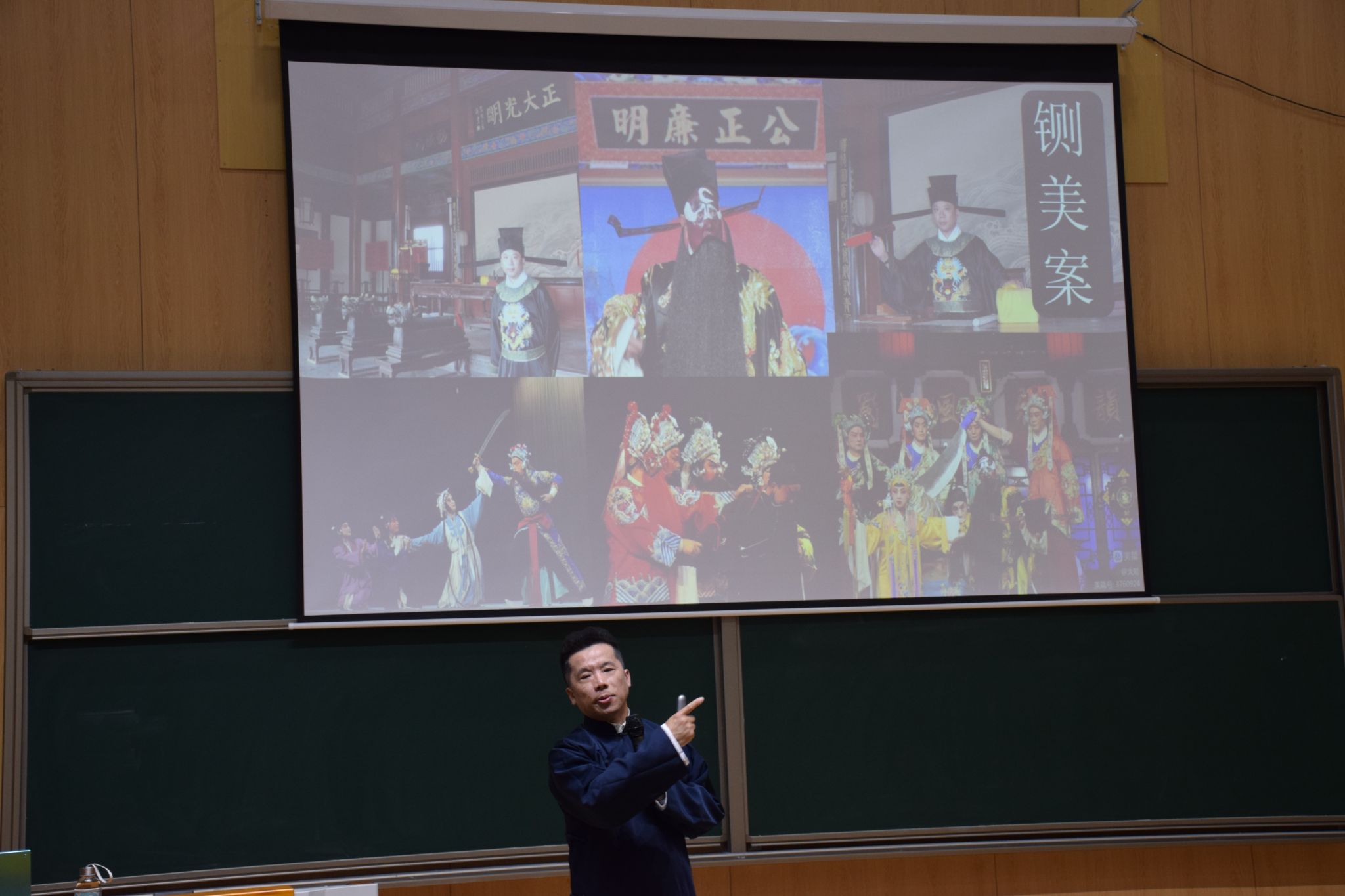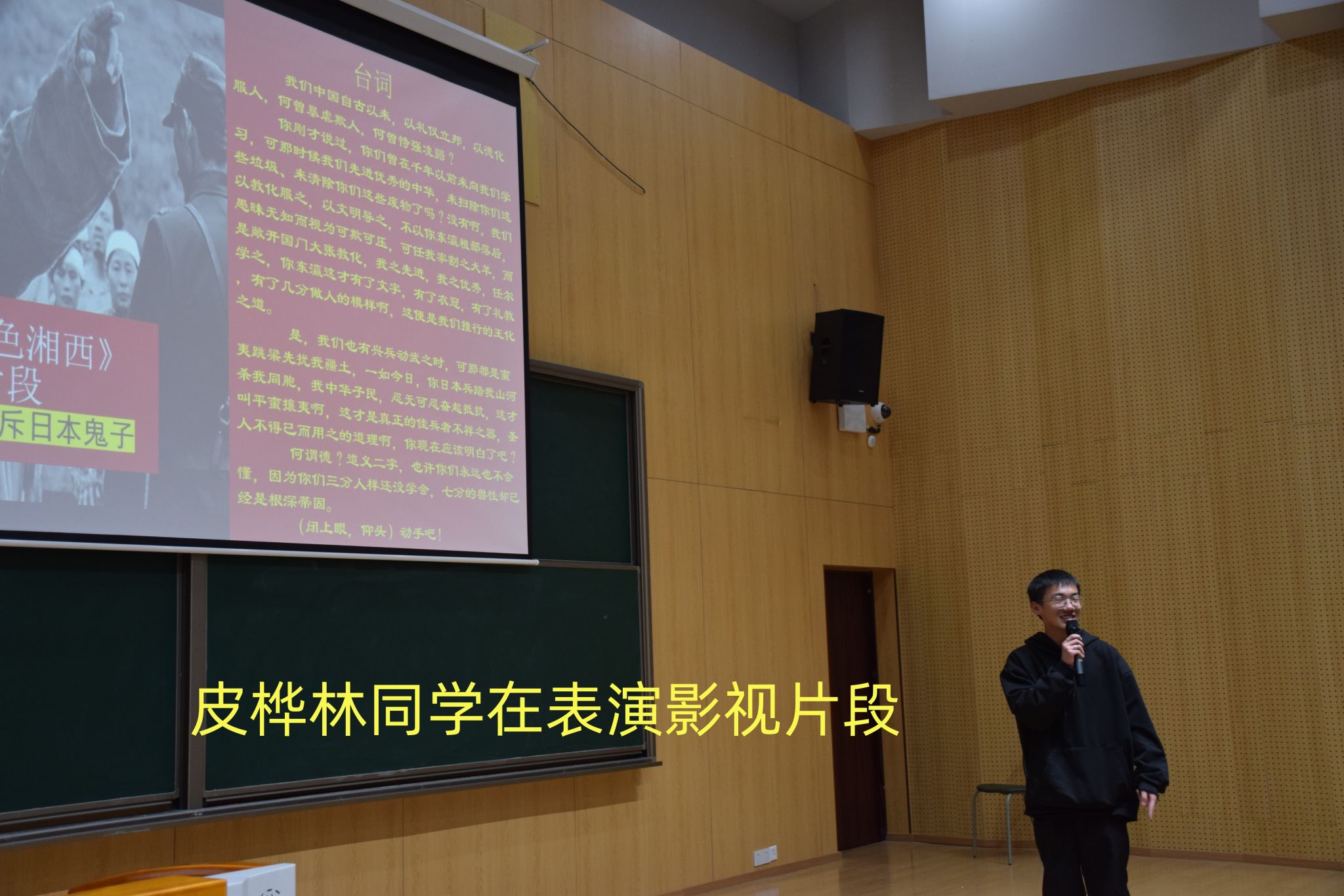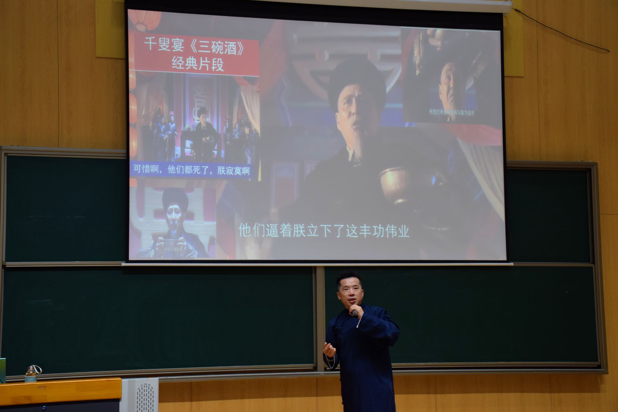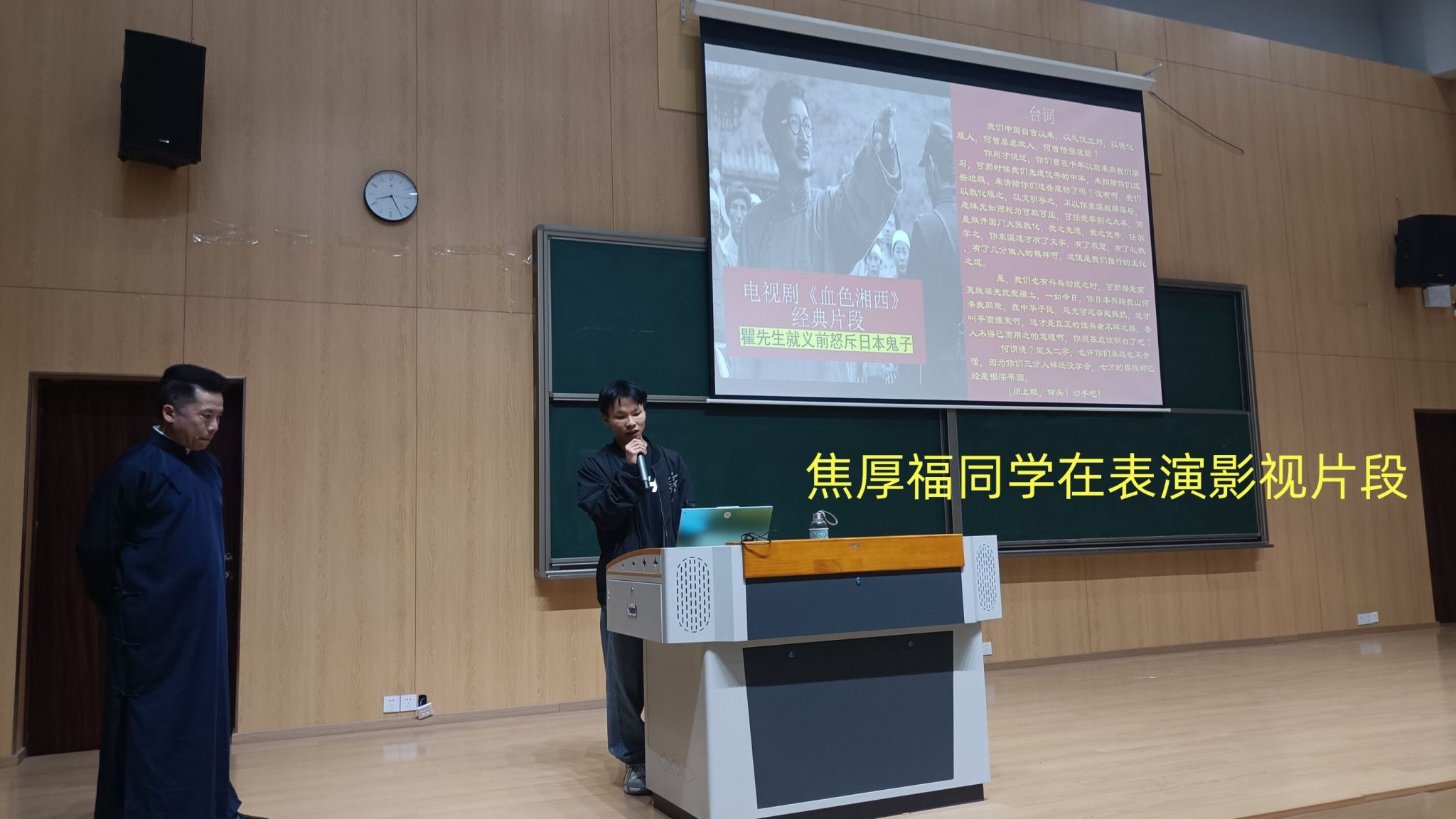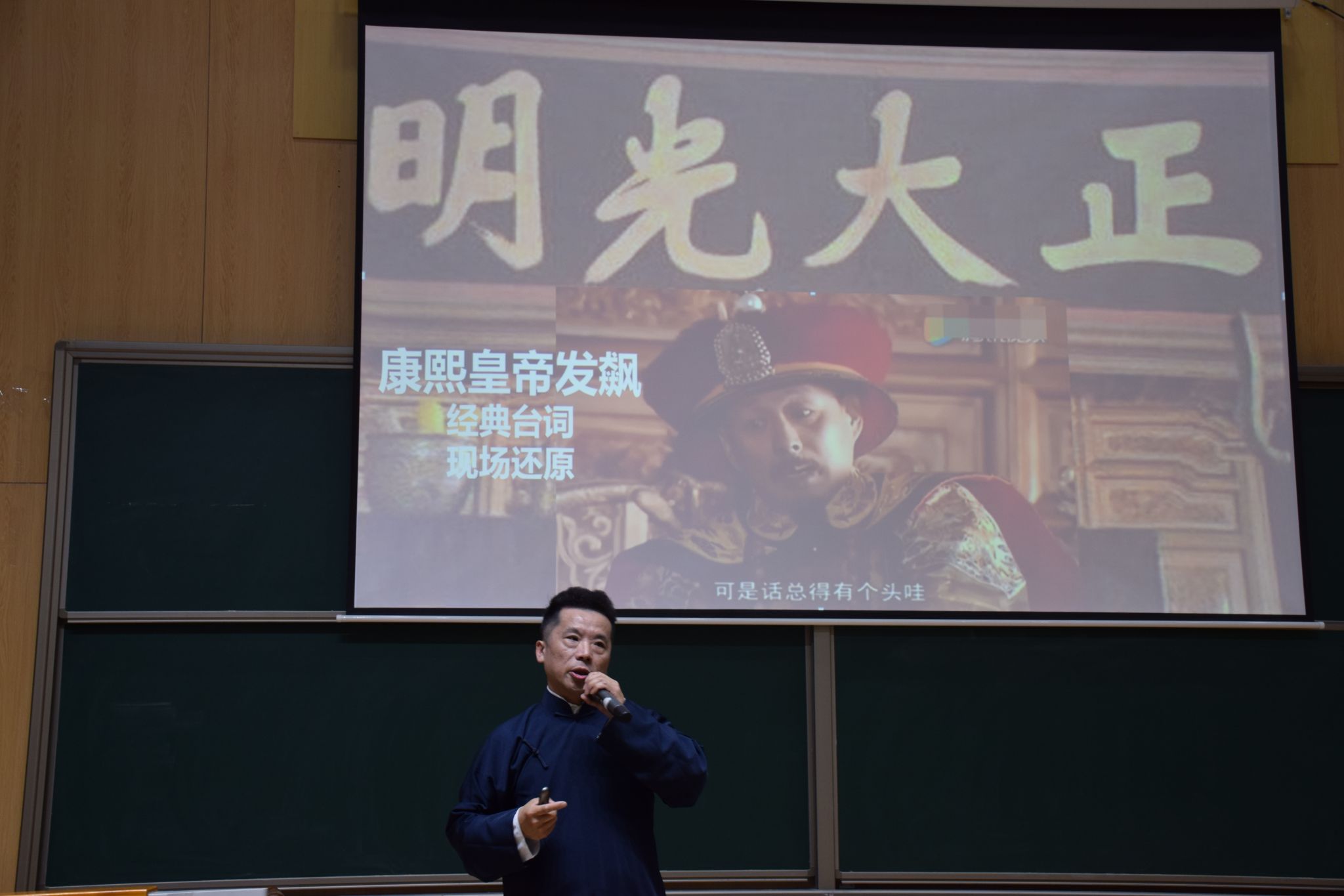 王老师首先放出一段《血色湘西》的电视剧片段,先后请了皮桦林和焦厚福两位同学上台,表演了这段令人荡气回肠的片段,王老师给了两位同学足够的表扬。他接着给同学们演唱了国粹京剧《铡美案》选段,博得了热烈喝彩。接下来的《千叟宴》和《康熙王朝》影视片段表演,王老师的炸裂演技,将不同时期的帝王气度完美还原,从来没有老师如此这般讲座,新奇的就是吸睛的,同学们的掌声一浪高过一浪。每表演一个曲目,王老师都会讲讲这个曲目前世今生的由来,让大家在享受精彩剧情和台词的同时,也知道了很多知识。