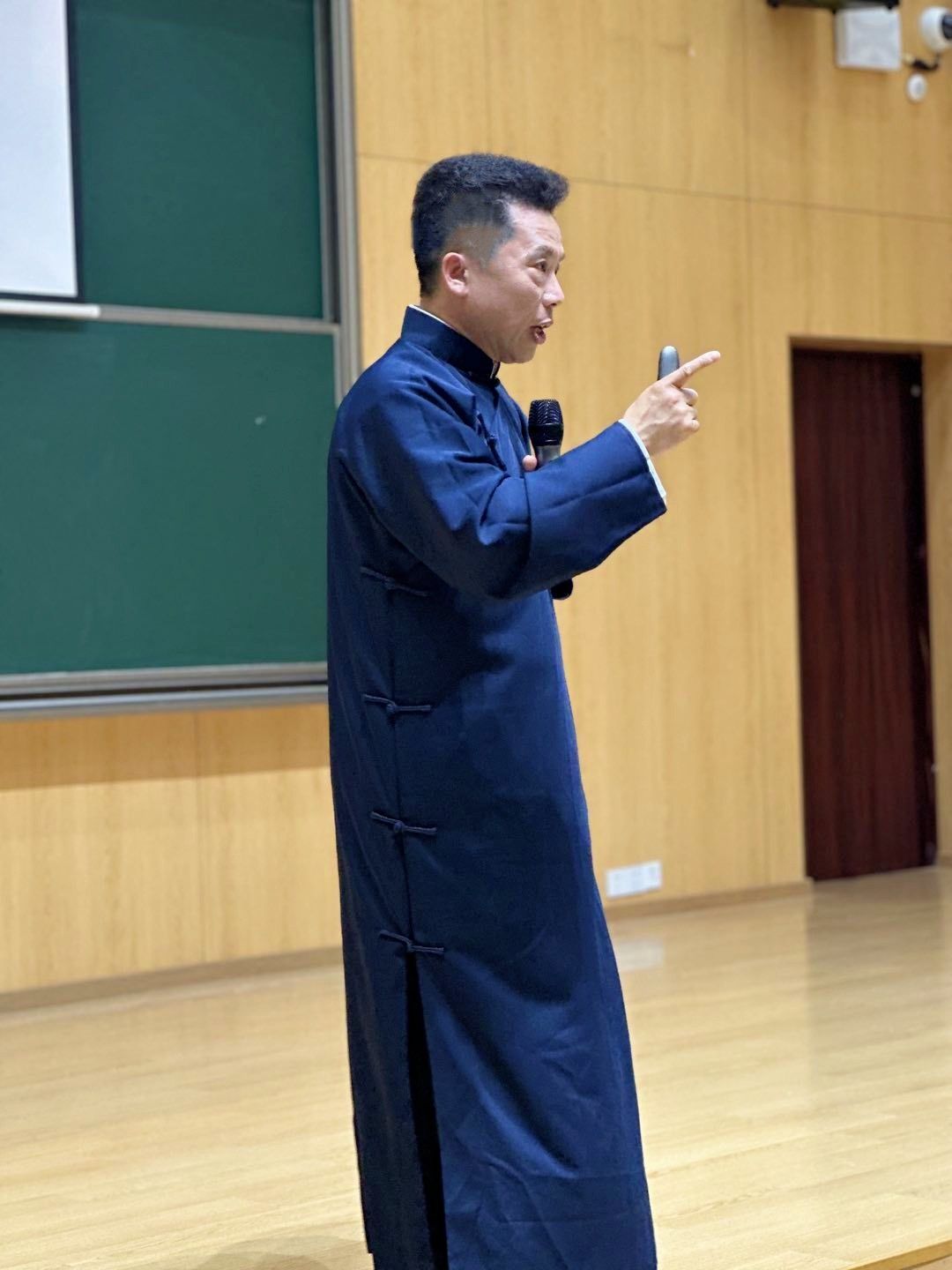 讲座的后半部分,王老师手拿一把折扇,一头撞进了相声剧场。很多相声演员表演不了的长篇贯口,王老师都能一气呵成,传统评书《八扇屏》之《莽撞人》,传统相声贯口《地理图》《报菜名》等,王老师行云流水,那嘴皮子,就像装有一部永动马达,哒哒哒地策马奔腾,一半以上的同学都拿着手机直播或录制,抖音等媒体上全是王老师各种表演的小视频,这到底是文学讲座还是德云社剧场?很多同学当场表示,听了王老师的讲座,都有学习曲艺、让自己变成一个有趣人的冲动。