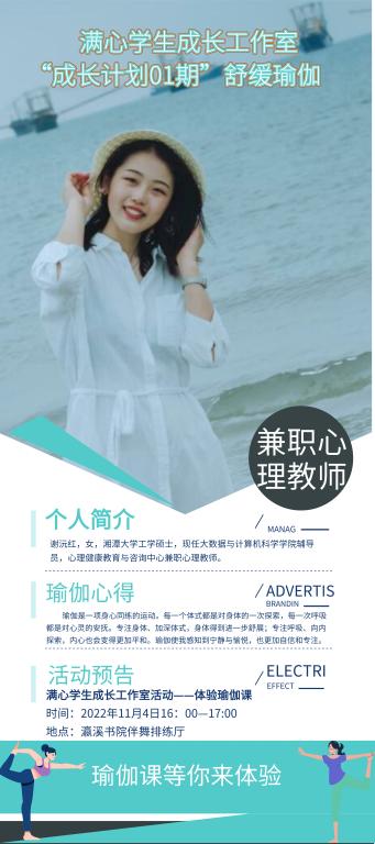 为培养师生“自尊自信、理性平和、积极向上”的心态,提升心理健康水平。2022年11月4日,由“满心”学生成长工作室组织的“成长计划01期”舒缓瑜伽活动于重庆移通学院(綦江校区)瀛溪书院伴舞排练厅顺利开展。此次舒缓瑜伽活动由湘潭大学工学硕士、现任大数据与计算机科学学院辅导员、心理健康教育与咨询中心兼职心理教师谢沅红老师带领。
