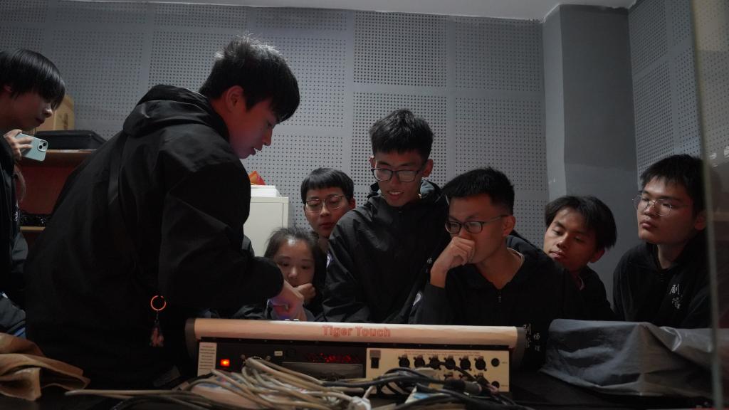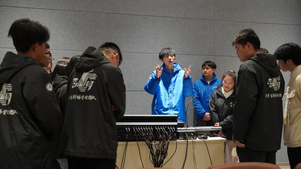 最后来到了本次交流会的最后一站——缤果大剧院,合川校区剧管团队带着綦江校区剧管团队走进了剧院工作最真实的样子。在这里双校区剧场管理团队进行了灯光、音响技术探讨,并让綦江小伙伴们亲手实践感受。“舞台演出其实是一个比较危险的工作,高空坠物、机械故障、电路短路等,稍有不慎就会酿成大错”从技术谈到安全、从阵地建设说到对待剧场管理工作的责任意识,一字一句都是合川校区剧管团队长期以来积累的经验。