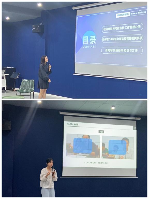 陈沁、张宵两位老师先后分别向我们介绍了校园网站与OA系统提交新闻的正确方式及注意事项、以及新闻稿摄图的注意事项和方法。首先陈老师讲解了发布校园官方新闻的OA系统流程申请和新闻宣传中写作的规范,同时讲解了新闻的基本要素,大家也在培训中更加注意规范意识。然后张老师从拍摄的理论、技巧、器材等方面详细介绍了在校园新闻中如何拍好活动照片并筛选查看。针对校园新闻稿件要求、常见问题、特别是新闻报道工作中的拍摄技巧等问题,从专业的角度分享了自己的经验。张老师谈到:“照片是有生命的,它能更好的传递新闻的内容和价值”。