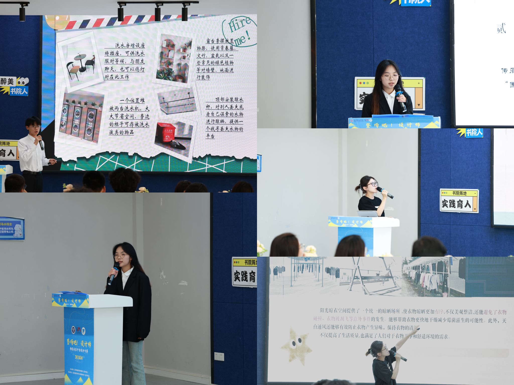 在各团队答辩代表风格鲜明多样,设计理念独特新颖,在现场展示答辩环节中表现优异。“还能设计出花来”团队注重文化传承,立足于綦河书院“演绎”培养基点,将传统非遗元素与现代技术相结合,希望打造具有历史氛围的独特空间供同学们享受;“睡在你下铺的偷感设计师”团队则关注平台设计实用性,改造出符合学生所需的晾晒空间,切实解决生活中的日常需求;“不知道在干啥”团队答辩代表以“功能室的文化底蕴应来自大篇的文字还是具有创意性的设计呢?”为引,提问评委老师,讲解团队自主设计的非遗瓶子,将艺术与节气相融合,建设独具一格的校园景观。