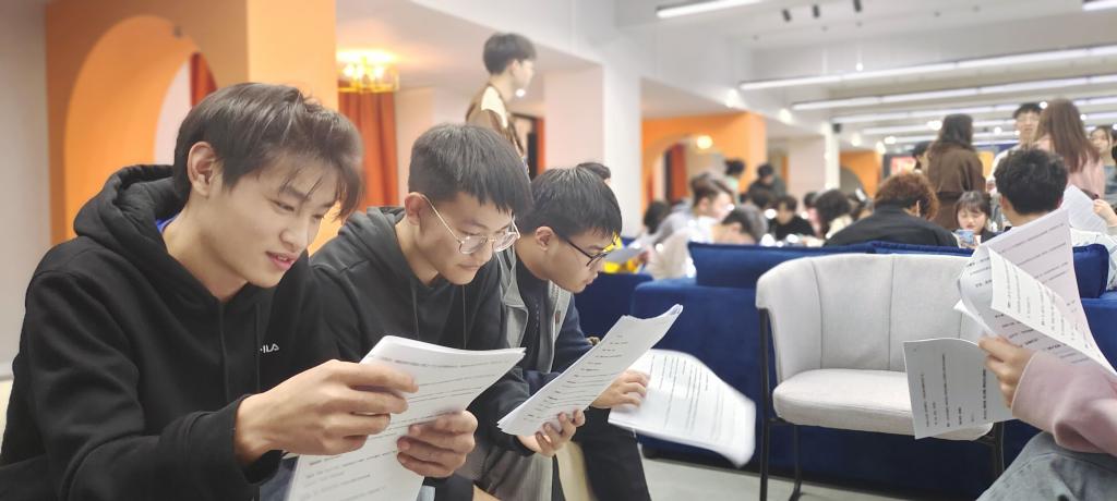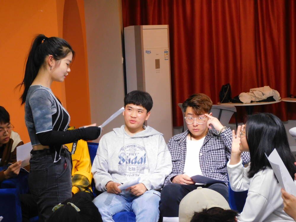 为了进一步深入理解剧本,各个小组人员围坐在一起共同研读剧本。首先,同学们依次进行了简短的自我介绍,演员们逐渐熟悉起来。随后,编剧人员向演员们讲述了每个角色的人物设定及场景细节。演员们兴趣浓厚、热情高涨,对剧本中的细节进行了一次又一次的润色、调整,仔细斟酌剧中人物的心理变化。经过初步的讨论,演员们开始进行首次台词互对,字字清楚且情感细腻,快速地融入到人物角色之中,初次体验人物角色的心理情感。经过两轮围读后,剧组人员共同商讨了排剧的时间和地点,同学们的心中浮起了万千期待。