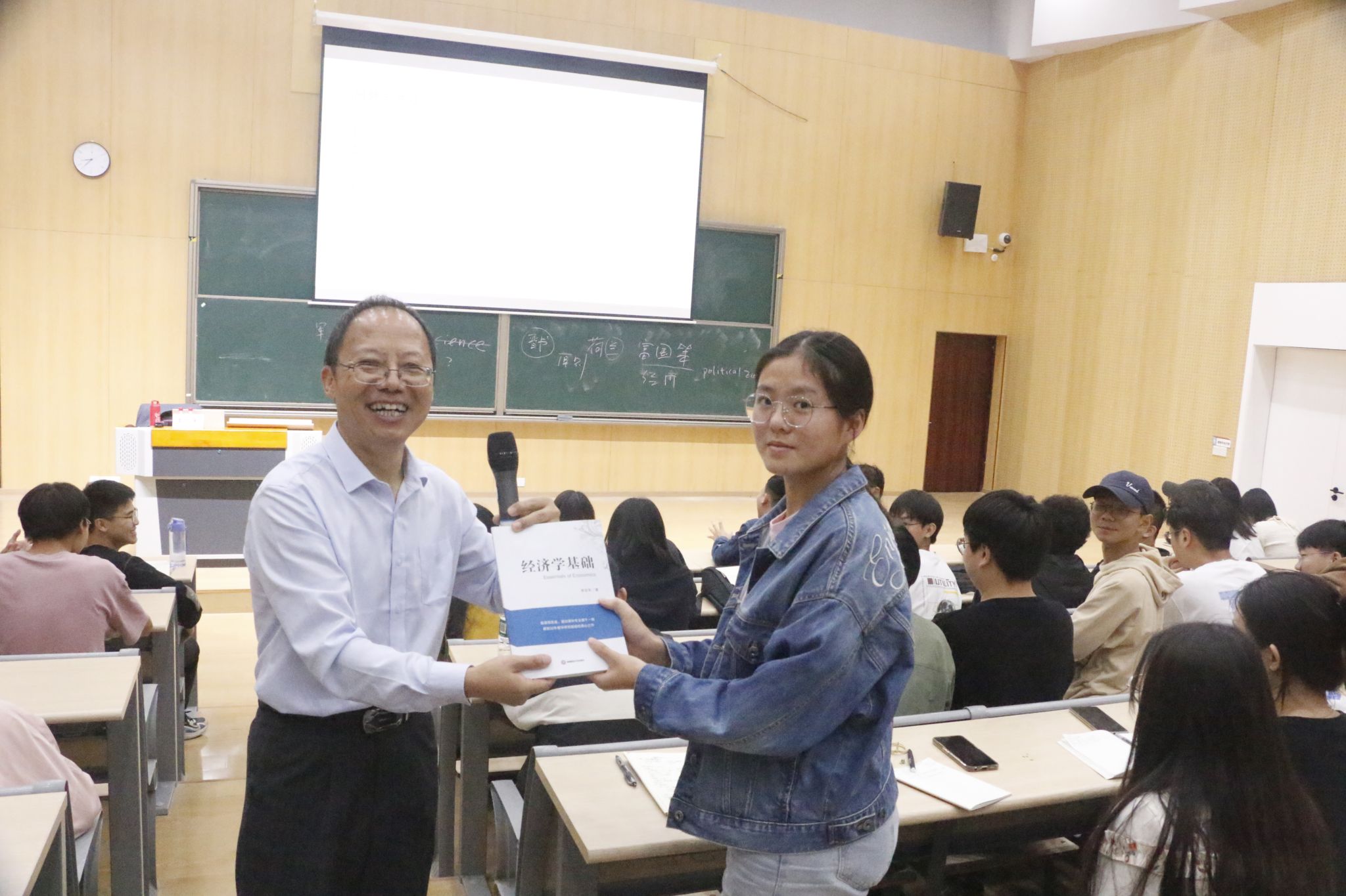 讲到最后,李教授激动地说道:“经世济民,孜孜以求,中国的未来是你们的,祖国的大任定由你们肩负,而经济学的未来,也注定寄托于你们身上,我相信,这门学科定将拥有无限前景!”李教授还赠与三位表现优异的同学自己的书籍《经济学基础》,让同学们能进一步懂得经济奥秘、了解丰富多彩的经济世界,讲座由此完美落幕。