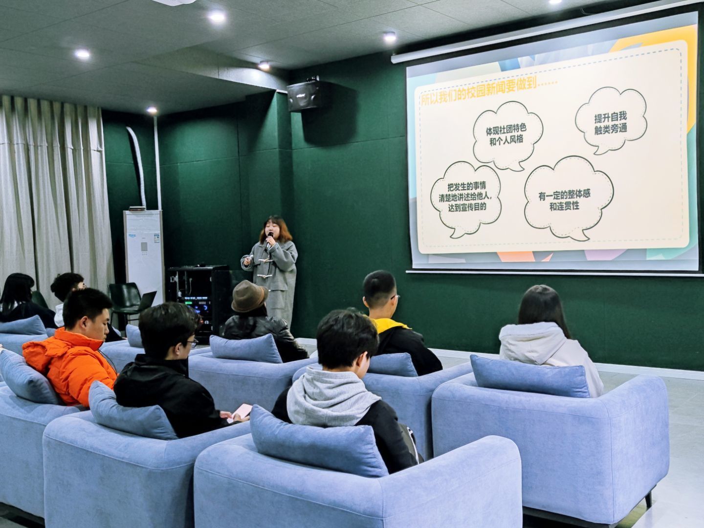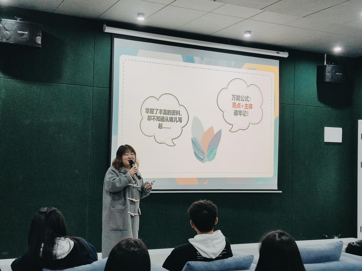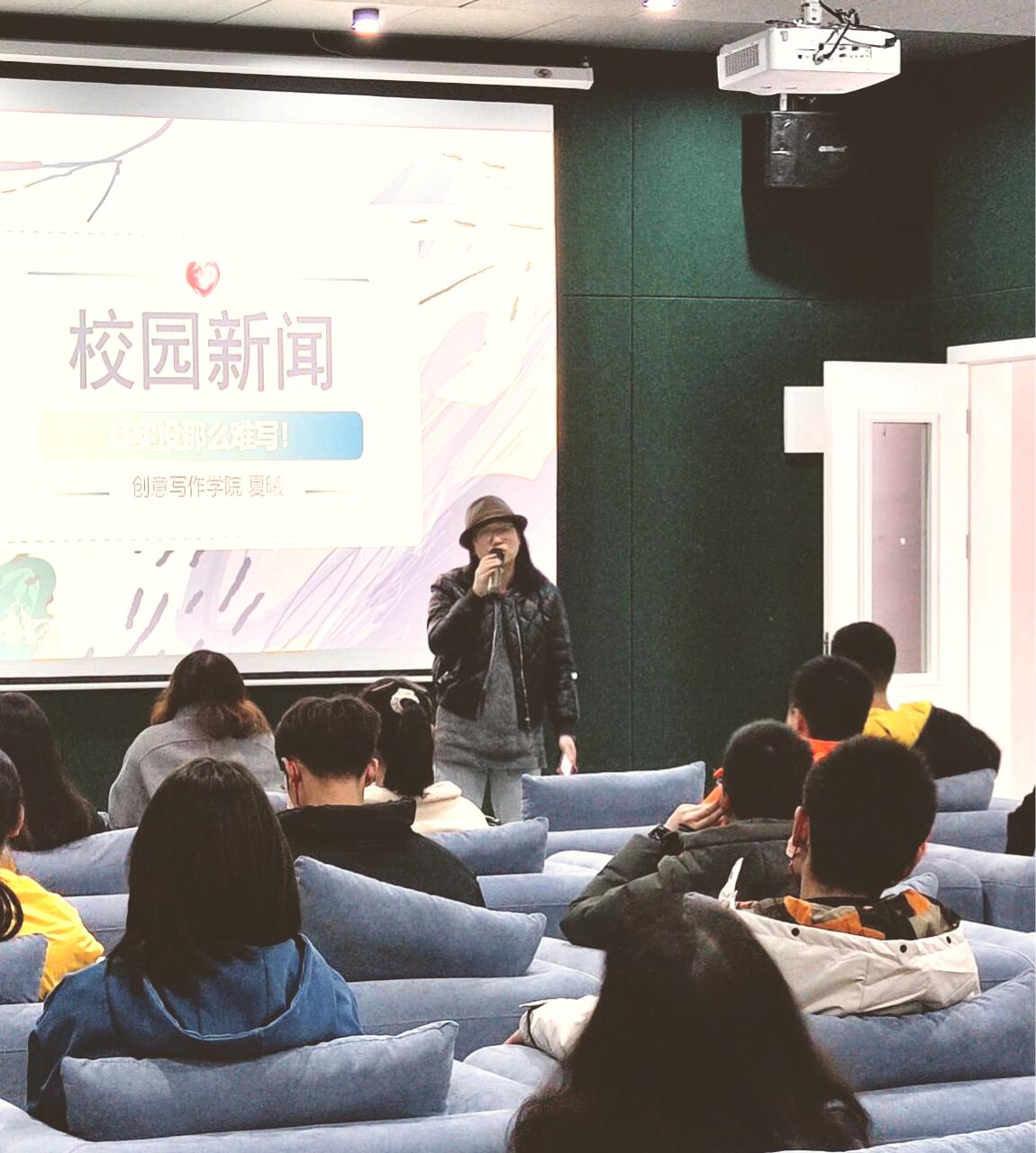 夏曦老师向大家介绍了自己写过小说,做过杂志编辑,也做过新媒体内容和运营,多次写过10W+的爆款文。此次接到文学社的邀请后,她愉快地答应了,很愿意为同学们写作校园新闻提供一些思路和方法。