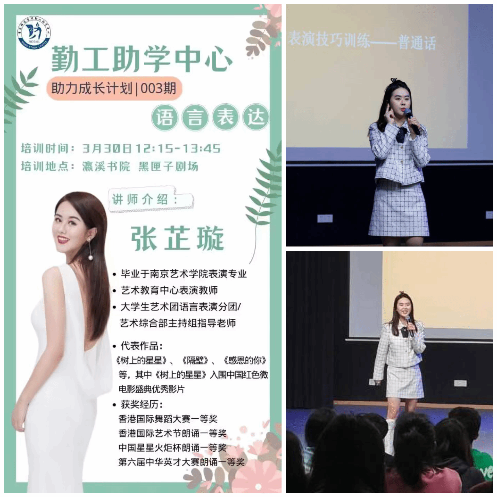 言为心声,语为心境。语言是人与人沟通的基本方式,是融入社会必要的技能之一,为提高綦江校区勤工岗位在岗同学的语言表达水平,增强沟通能力,勤工助学中心于2023年3月30日12:15-13:45在瀛溪书院黑匣子剧场组织开展助力成长计划03期——语言表达技巧培训。本期培训邀请綦江校区艺术教育中心表演老师张芷璇主讲,培训由勤工助学中心指导老师温宗航主持。