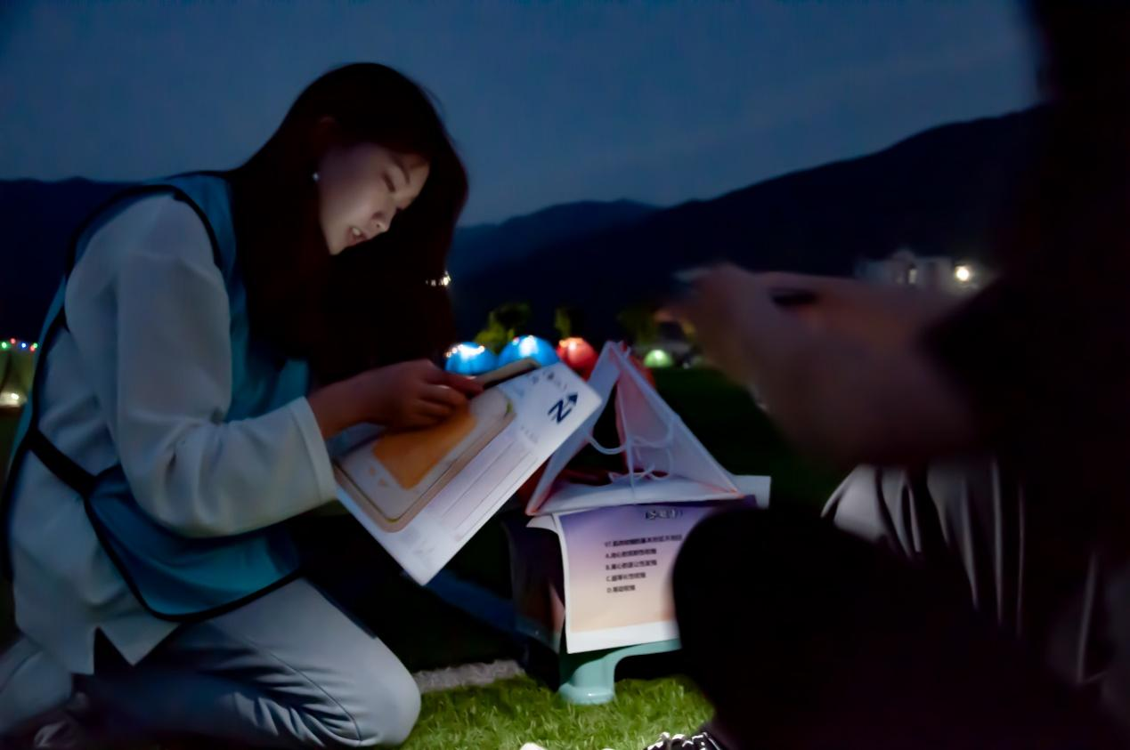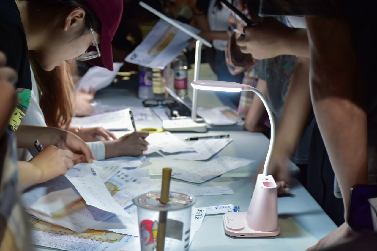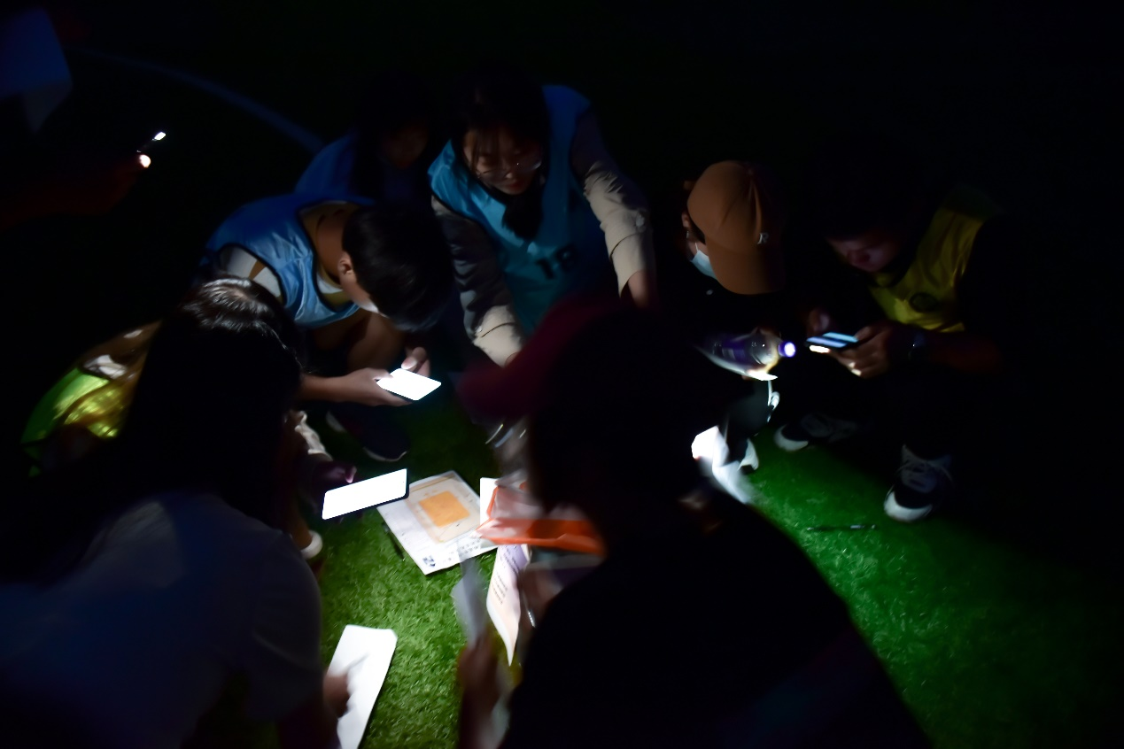活动现场,在参赛者自己的手机灯光下,有的同学在照路寻点急奔;有的同学在照着题目认真答题。团队两人分工合作互帮互助,无形中拉近了彼此之间的关系,增进了彼此之间的默契。场外,统计成绩的同学也在紧张的为活动参与者计算得分并统计名次,并为前八名的小组颁发奖品。